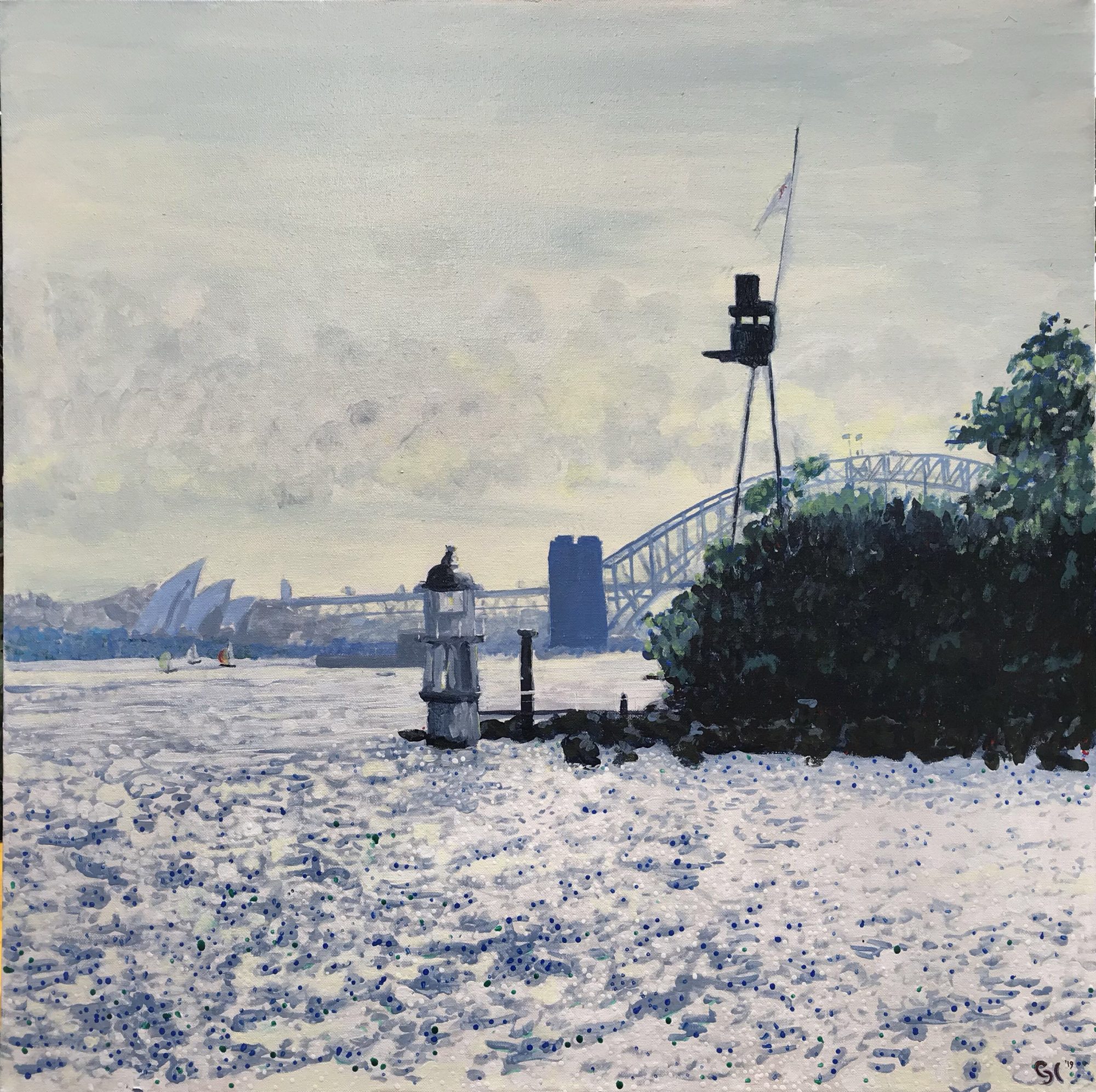 Acylic painting on Stretched Canvas is of Bradleys Head in Sydney Harbour, looking towards the city in the afternoon sun.