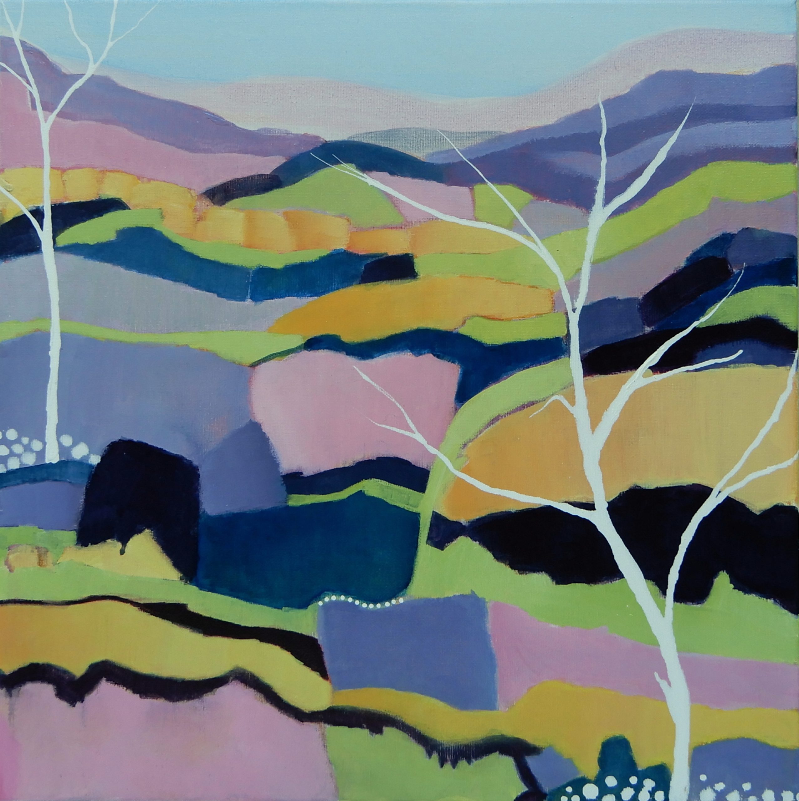 As the chill of winter sets in I feel I’m resisting by revisiting colours more suggestive of warm summer days, and in the process creating some artworks that are more about feelings than places. They are imagined landscapes, somewhere some of us might yearn to be. I particularly loved the pairing of lime green and hues of purple in this one.