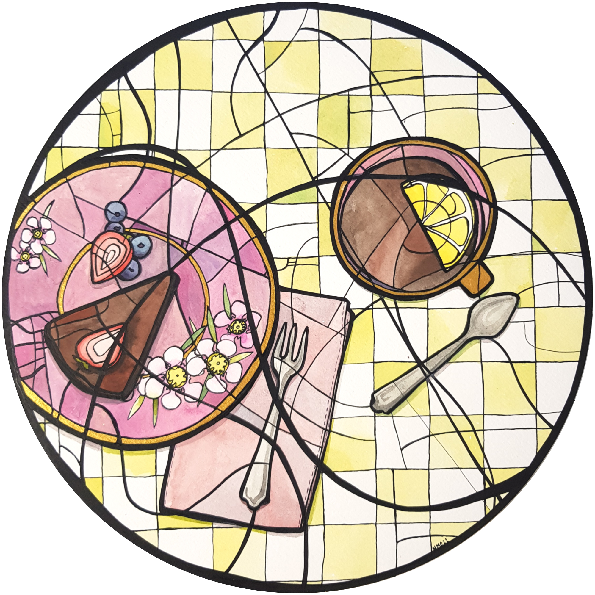 Afternoon Tea by Nicola Cowie – This stain glass style still life is a sweet original painting with watercolour washes held together with black ink linework.