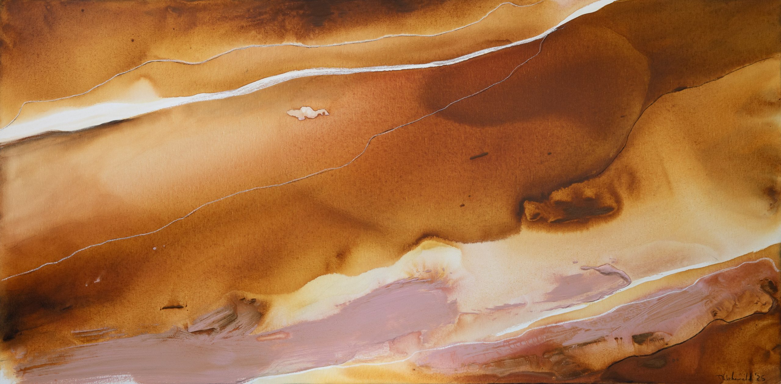 I have mixed a variety of desert colours for use in these paintings: ochres, terracotta’s, pinks, and browns, plus a selection of oxide, to create the effect of moving through this unique landscape.