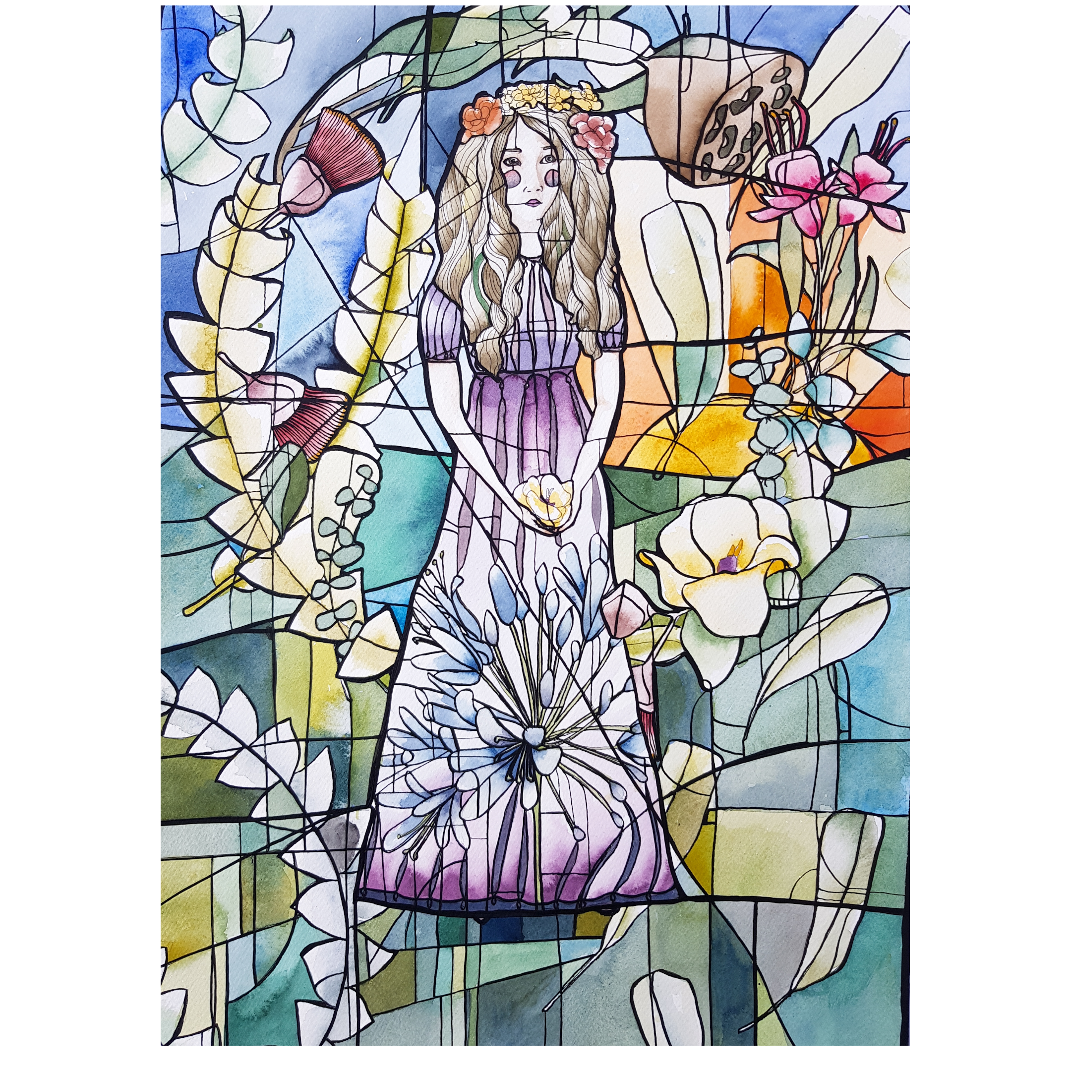 An art nouveau style female figure in purple surrounded by flowers and leaves. Fuchsias, cottonwood, banksia leaves, flowering gum and eucalyptus leaves.