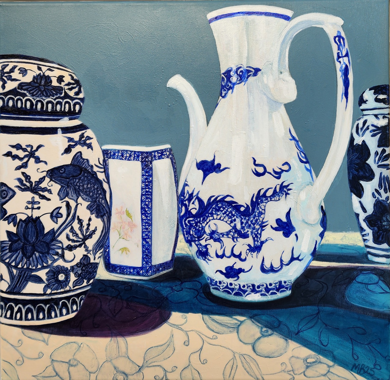 The bold cobalt motifs of -fish, florals and a dragon stand out against the serene teal background, giving this artwork both elegance and personality.