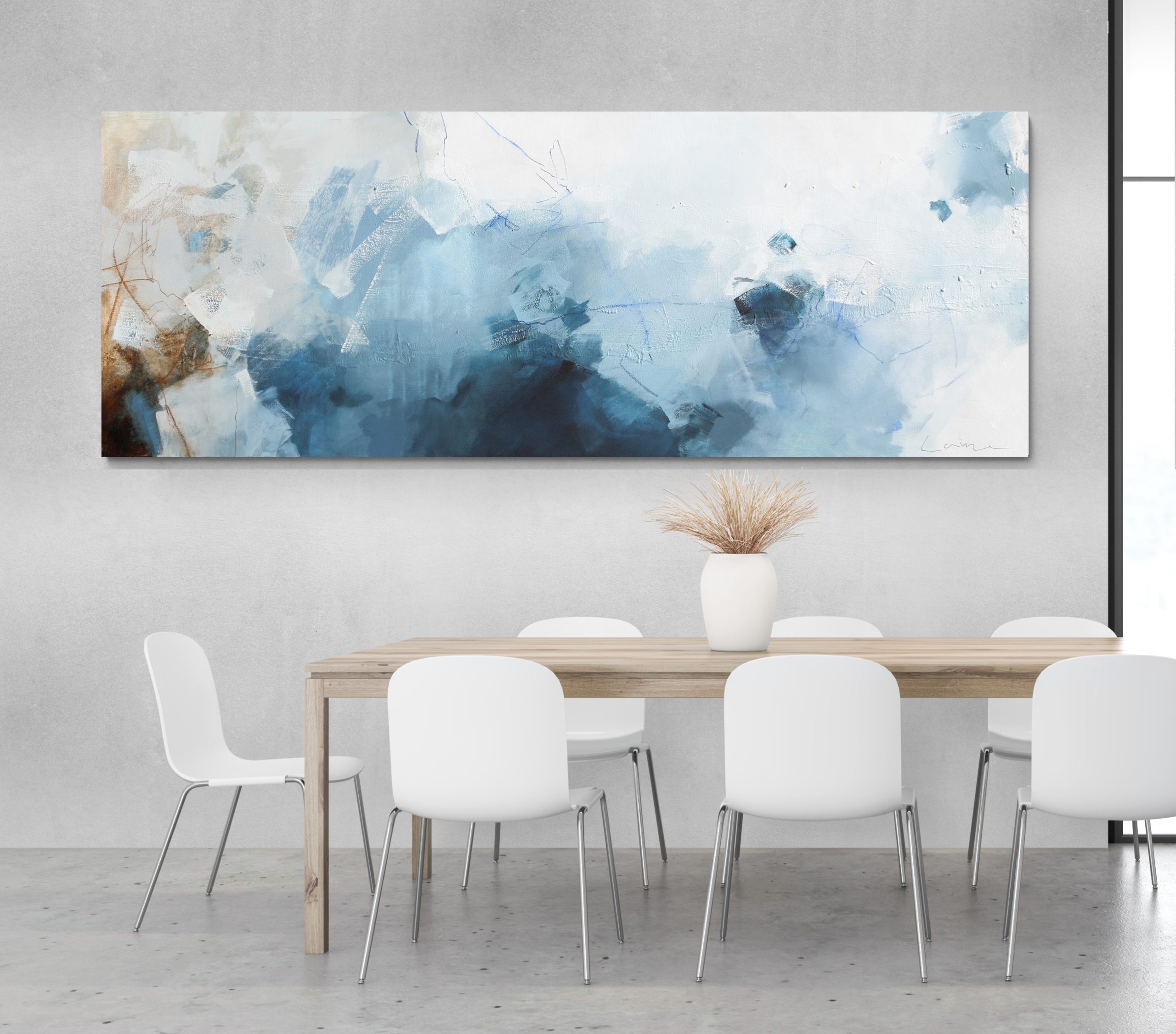 Ajna is very textured and a combination of grey blues and grey taupes with a touch of rust brown. She is painted on 12oz canvas stretched onto a quality custom made frame. The image wraps around the 3.8cm sides so Ajna is ready to hang.