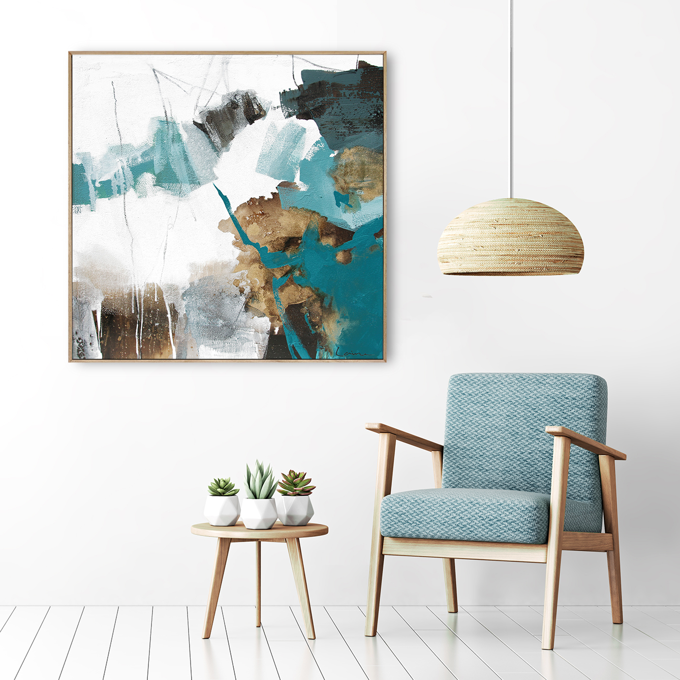 Alessio is very textured and is a combination of greens, greys and browns with a touch of gold. The painting extends around the 3.8cm sides of the canvas so it’s ready to hang. An oak floating frame (as in room images) can be included for an additional $260.