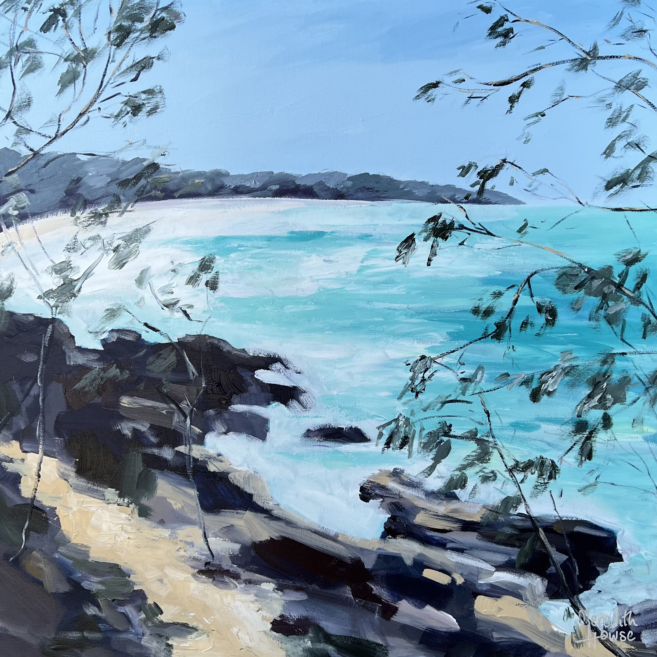 Alexandria Bay Noosa by Meredith Howse is a tribute to the rugged beauty of Noosa National Park. The painting in a square canvas format, captures a moment of intense movement and energy. The coastal trees in the foreground are depicted with leaves blowing in the wind, conveying a sense of motion and dynamism.