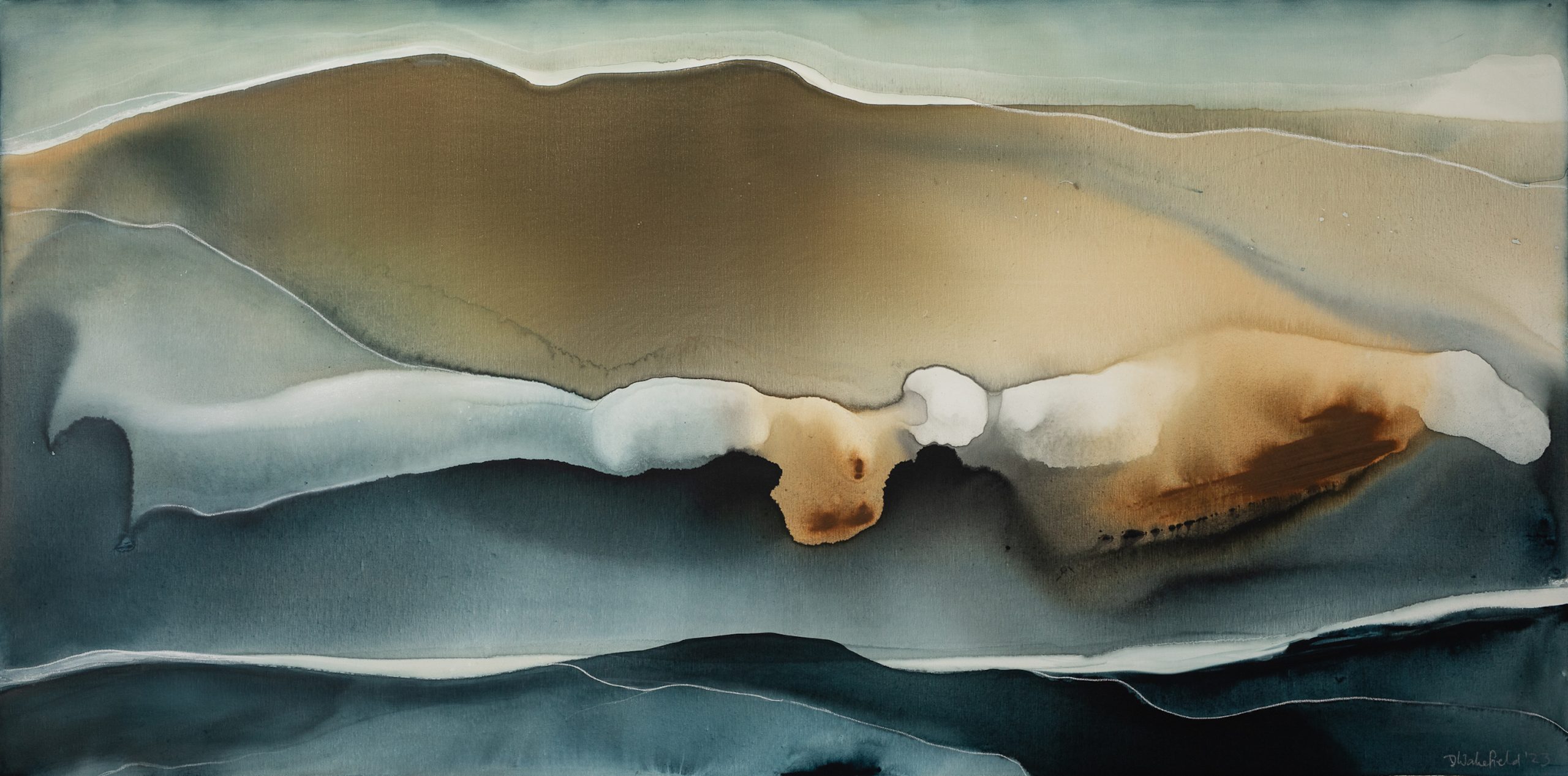 Algarve by Dinah Wakefield is inspired by the light, the colours and the natural beauty of the Noosa region of Australia. “What I love most about Noosa is the interplay of light. From the oceans to the clouds, to the river estuaries and the hinterland, this canvas unfolds before me every day and finds expression in my paintings”.