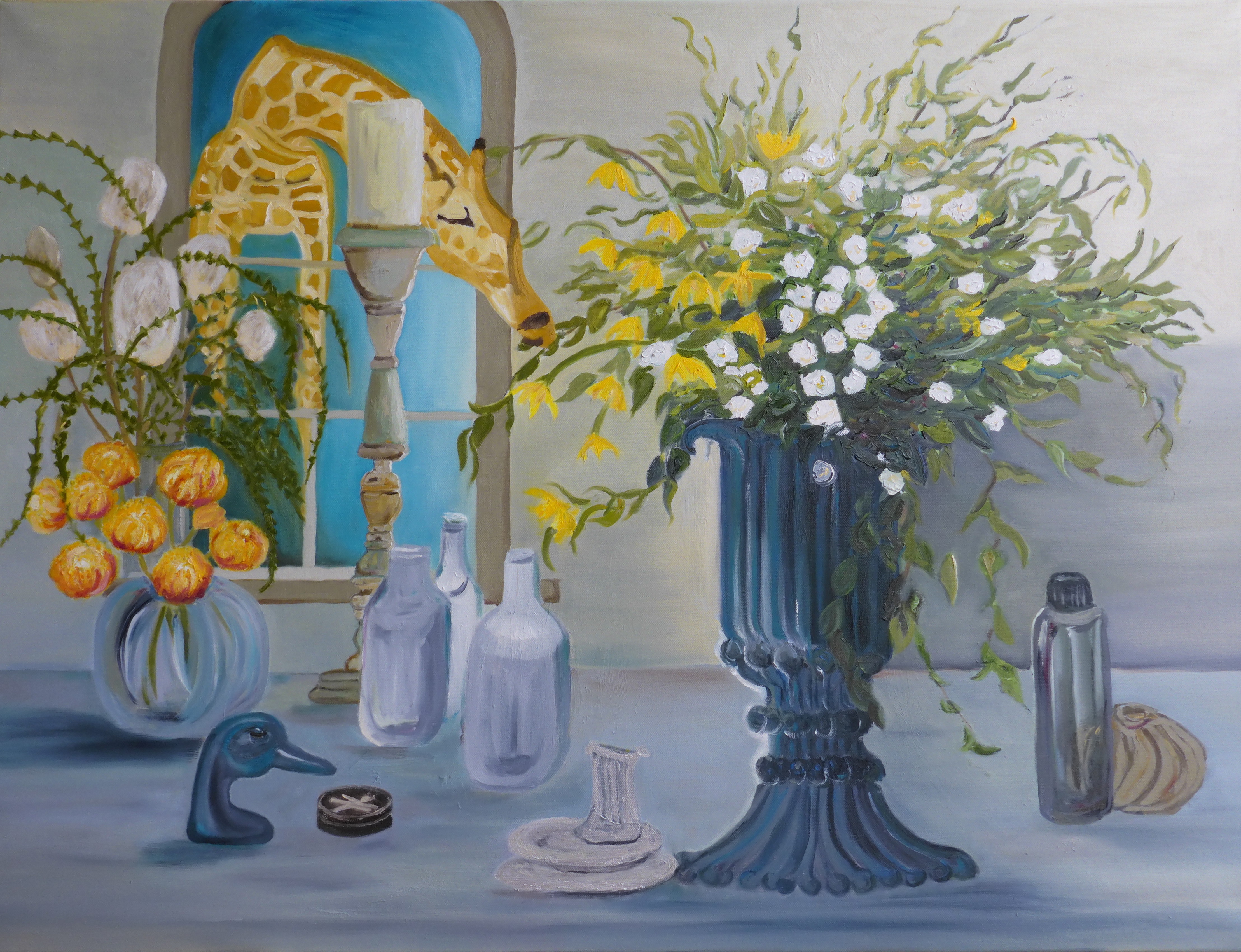 Alice theres a giraffe in the window and its eating your daffodils – thats nice dear – Oil on canvas by Kim Rees. Another resurrected painting, reworked in the age of corona. It didn’t hit the spot so left incomplete for a couple of years. Original intention was for a tranquil and restful still life with a limited colour palette, following a rash of brightly coloured loud works… Â The end result at the time however was just plain dull, so it sank to a back wall, waiting patiently along with a bunch of others in the same boat. Now the collection of unfinished works has grown alarmingly so my task is to ‘finish’ them before I start something new. So it needed something to brighten it up – what more incongruous in Australia than a giraffe leaning through an open window munching on a vase of flowers.