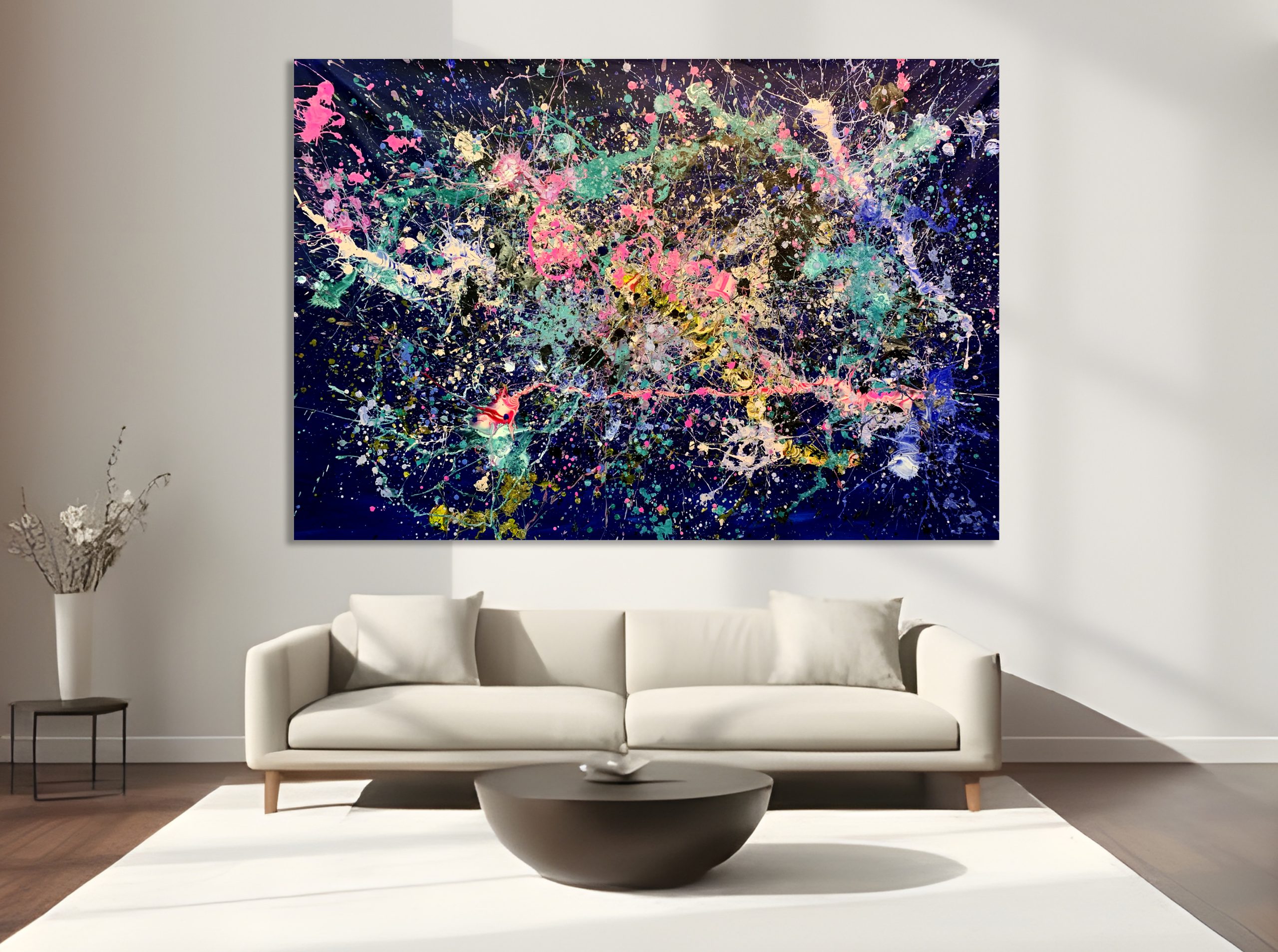This artwork is painted on professional-grade canvas stretched and sealed with varnish. The canvas has dimensions of 198 cm in width by 135cm in height. The painting wraps around the sides of the stretcher, so the sides are painted in the same style as the surface. As such, it does not need a frame.