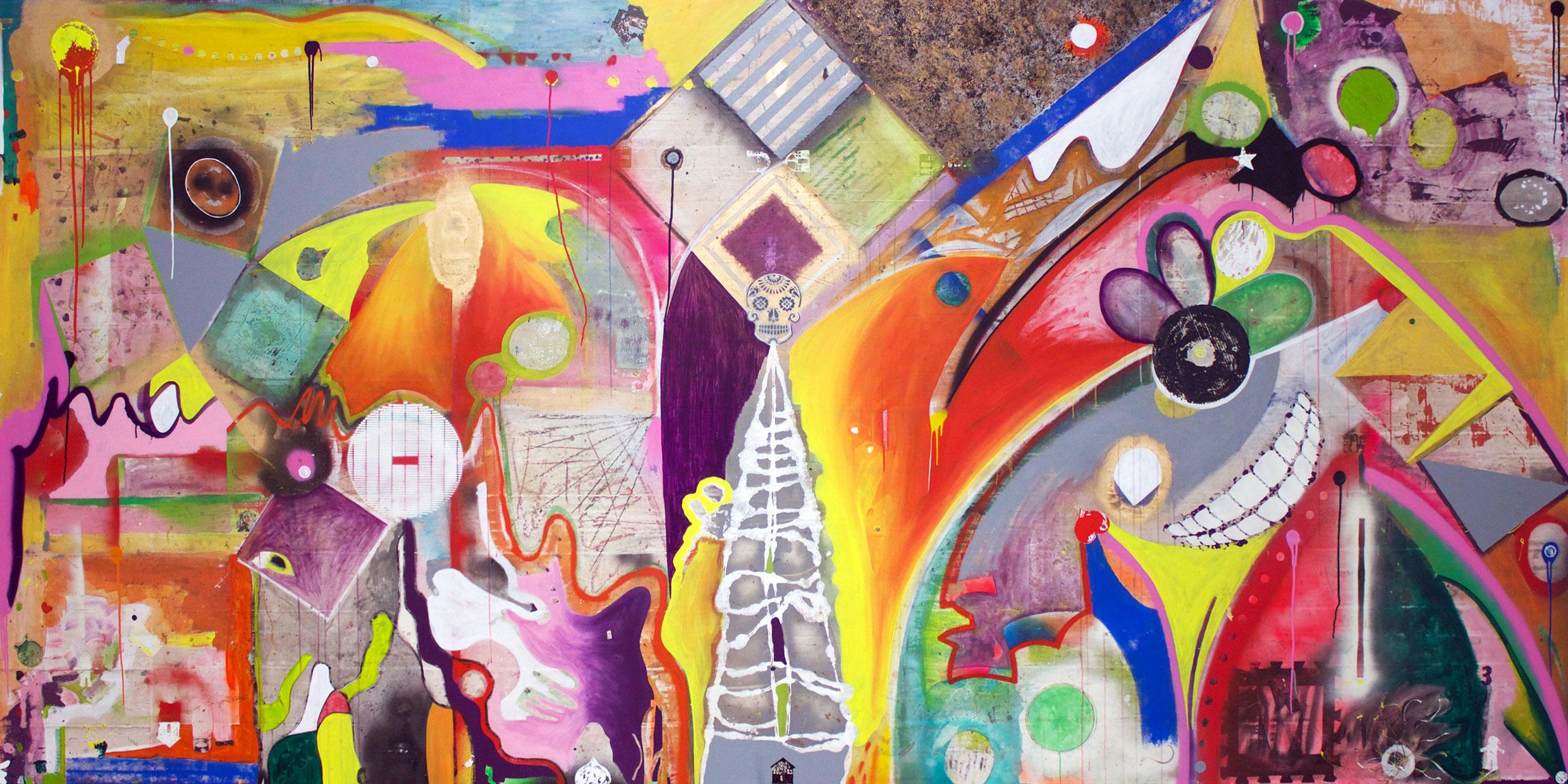 Art, life, love, death, immortality and a respectable haircut, The Glitch Mob, Dubuffet; the real mr art, parenthood, fear, family, home, mother is god, heart, Miro, circles, lines, houses, fluro, slow and steady, skulls, change [in the house of flies], brushes (weapon of choice), a little devil, a lot of love, the marks we leave behind, drips, drops, daydreams, straight lines, masking tape, more tape, paint lids, flipped lids, paint skins, leftovers born again; reprise, evolution and afterthoughts, Sansom, figures, Kitaj, abstract, thoughts, theories (no conspiracies), contradictions, Basquiat, most middle aged kings get their hair cut off, crowns, and veneers, chitter chatter doesn’t matter, Stuck Mojo, see none, hear none, speak none; evil monkeys, hold your tongue, hold your breath, count to ten, fall apart, start again, Placebo, fix everything, destroy nothing, reverse, verses on versus, flailing appendages, no step, wrong step, dub step, two left feet, shuffle shuffle, rabble rabble, bitch bitch, let it go, frozen, ice axe, pick [your] axe, crescent moon, the girl who climbed a mountain, not impressed?, no time, (for) self doubt, derived from failure, self portrait, edit, EDit, ego, envy, process, princess (warrior), everything everything, Underworld, movement, motion is commotion, momentum is key, turn, turned, corner, don’t cut corners, cut ties, cut and paste, contemporary leftovers, all that you can’t leave behind (but probably should), all that could have been (but never will be), not now, not ever, but yesterday, backwards to go forwards, somewhere we will meet, in the story of the story, endless zeros, dancing skeletons, landfill, logos, no logo, not weeks, nor months, but years, building blocks, block out, black out, paint out, rework, reverb, constant, consonant, buy a vowel, letters, words, lists, sentences, ideas, images, buy now, die later, sell your soul, make a record, Tool, device, saviour, teething, gold tooth, grin, and bare it, bare all, bare everything, everything in it’s right place, Radiohead, a head of his time, time to sleep, sweet dreams (are made of these), these times, them bones, skeletal, system, structure, construction, misconstrue, reconstruct, ride the spiral to the end, the end of the beginning, the beginning of the end, the death of the author, choose your own adventure, advent, event, calendar, synced, psych, psy, trance, dance, delight, towards the light, no strobe, a new generation, a new level, Pantera, rainbow, dots, iris, masks, towers, circuses and churches, this is my church, Faithless, less anxiety, more sleep, sleep with the fishes, little fish, big fish, cardboard box, boxed in, boxed up, shadow boxing, stepping through my shadow, a memory, a moment, a choice, yours to choose, yours to lose, nervous energy (still?), grow the fuck up, but please let her be a child forever, forever, forever ever?, Outkast, outsider, diamonds are forever, diamond eyes, the eyes have it, IT, Whiteley, white, lie, bit, bat, the bat attacks, nocturnal, alchemy, magic, midnight, moon vs sun, flip, words, records, rhymes, Sage, Francis, Bacon, beats, bruises, poets and prose, primed, unprimed, endure, embrace, alter, altar, worship, obey, oblong, squares, stripes, strips, trips, delayed, gratification, obsessive compulsive behaviour, in an orderly fashion, fashionable art, calaveras, a dead sun, the thieves, time thieves, time misrepresents, space, direction, desire, accomplishments, now hear this, that, and the other thing, and another thing, the door is ajar, the journey, the ride, riding with death, laughing with death, laughing at death, choose life, choose reality, reality check, check your self, before you, self destruct, destruction as a form of creation, destroy all your gods, as gods do, as god am, AM, PM, 24/7, no rest for the, wicked, ready to bring that noise, a lot of noise, white noise, black space, negative space, the beauty of grey, no shades, no shading, no shadows, shadow dancer, move, the movement of memory, footprints, patterns, points of departure, 3 points where two lines meet, tesselate, Alt-J, joint, join, entangle, crossed wires, crossed lines, lines crossed, boundaries pushed, new frontiers, front and centre, centred, level, level up, next level, ready player one?, controls, commands, demands, hands on, hands up, down, roller coaster, round, cycles, circles, so many circles, motif, metaphor, more, or less, amounts, a careful count, balanced, blended, before and after, all at once, all for you, for her, for me, for family, family values, increased value, valuation, fees, find, funds, a solid foundation, slab, frame, feet, foot, book, Seuss, steps, angles, planes, trains, and automobiles, movement mashes, mashed up, mixed in, Mix Master Mike, bolt, nuts, balls, blades, stencils, layers, limbs, direction, Beckman, 3’s, mad three, the dream, distractions, retractions, rerouting, calculating, measuring, mixing, remix, remember, remember, members only, the only way is through, through out, outside in and upside down, down but not out, out but not in, in like sin, all my sins remembered, forgotten queens, taste the queen, Mona Lisa lips, hips, bare feet, belly, beauty, in the eyes, behold, her, hold her, close, but no cigar, up in smoke, and mirrors, games, drawings, diagrams, 21 grams, pound, pounding, a flaming heart, sacred, and wired, scared and weird, connected; join the dots, more circles, sharks circle, sharp teeth, beneath, that which lies, a creative truth, trade, fade, resistant, resist, refuse, fuse, blown, bomb, tick, tick, tick, boom, doom, doomed, by desire, determination, marked in skin, flesh, goodness, greatness, great heights, high times, chimes, bells, toll, for whom?, unanswered questions and answers unquestioned, a quest, a challenge, a task, mask, face, the facts, the track, record, cut the cord, new creation, breathe just breathe, keep breathing, don’t lose your nerve, phew, for a minute there, I lost myself,