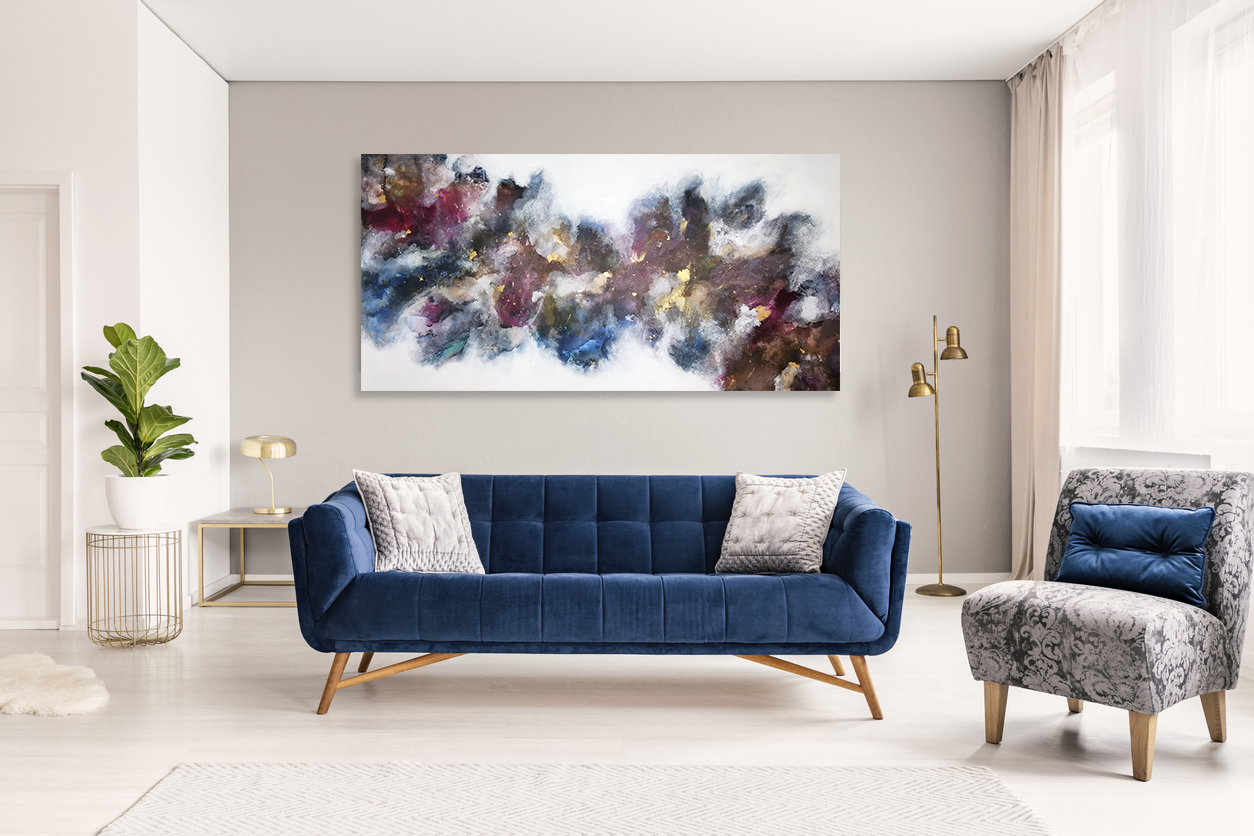 Throughout this extra large statement original abstract piece, there are metallic gold paints and gold leaf that shine in different lights throughout the day. Bringing the piece to life and giving it an extra special glimmer.