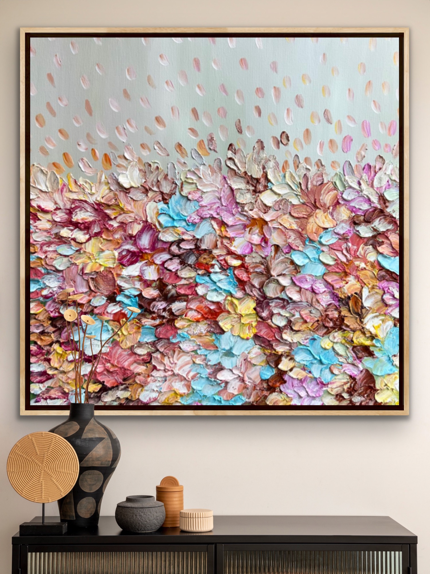 All you need is Love by Theo Papathomas is a painting with lots of layers of beautiful warm and cool colours of flowers and petals covering the field. The landscape becomes a bouquet of petals dancing over the land. I tried to create this beautiful composition of soft colours of the landscape of flowers and petals making a beautiful field of memories . Capturing the beautiful colours of the petals, like musical notes dancing over the landscape, painted in acrylics with a pallet knife. The field comes to life with the sounds of the petals creating movement and rhythms. Painted with a pallet knife makes the painting full of energy with lots of acrylic paint creating so much texture. The painting comes with an external frame.The painting is signed and dated at the back and comes with a certificate of Authenticity.