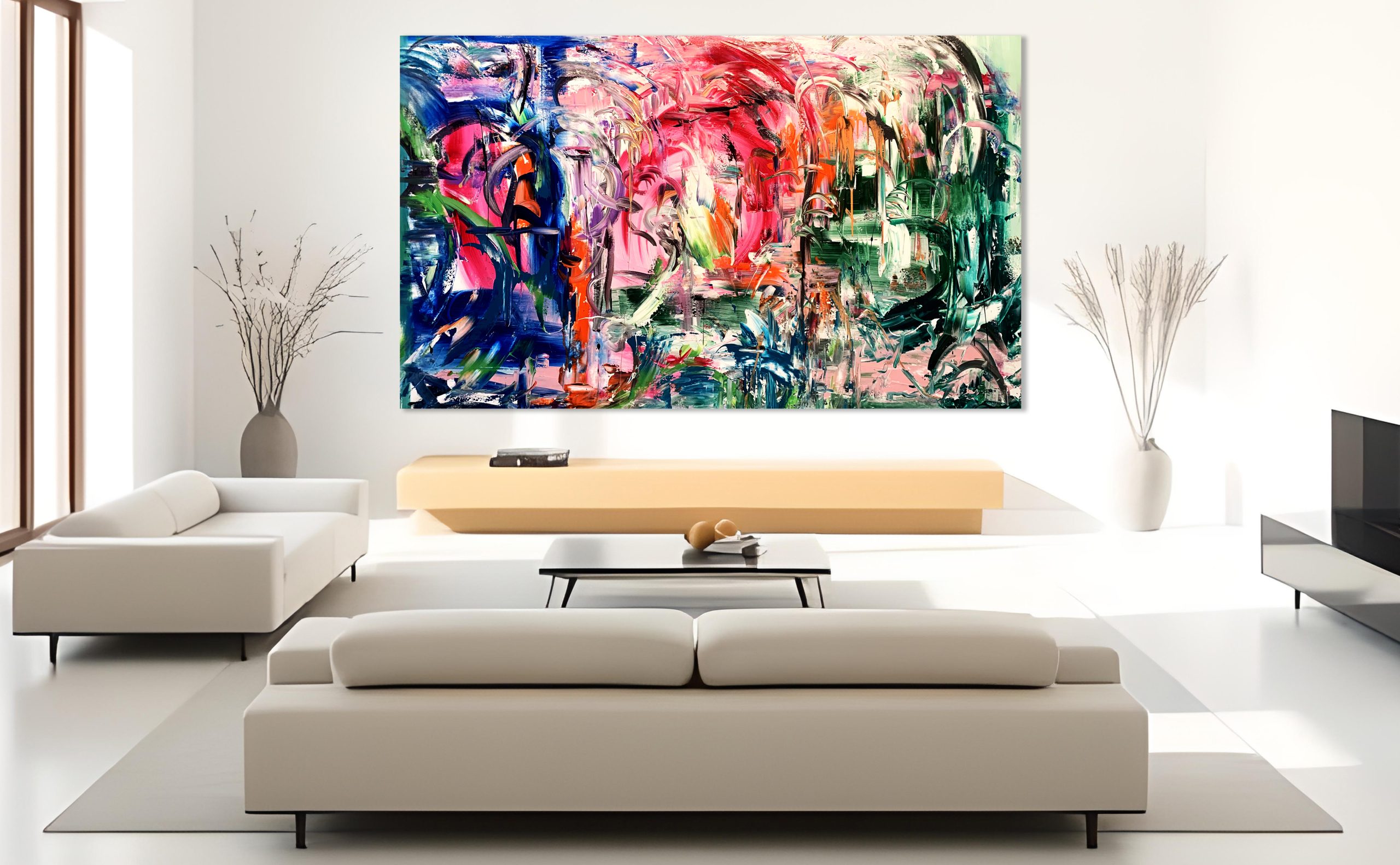 This artwork is painted on professional-grade canvas stretched and sealed with varnish. The canvas has dimensions 200 cm in width by 120 cm in height. The painting wraps around the sides of the stretcher, so the sides are painted in the same style as the surface. As such it does not need a frame.