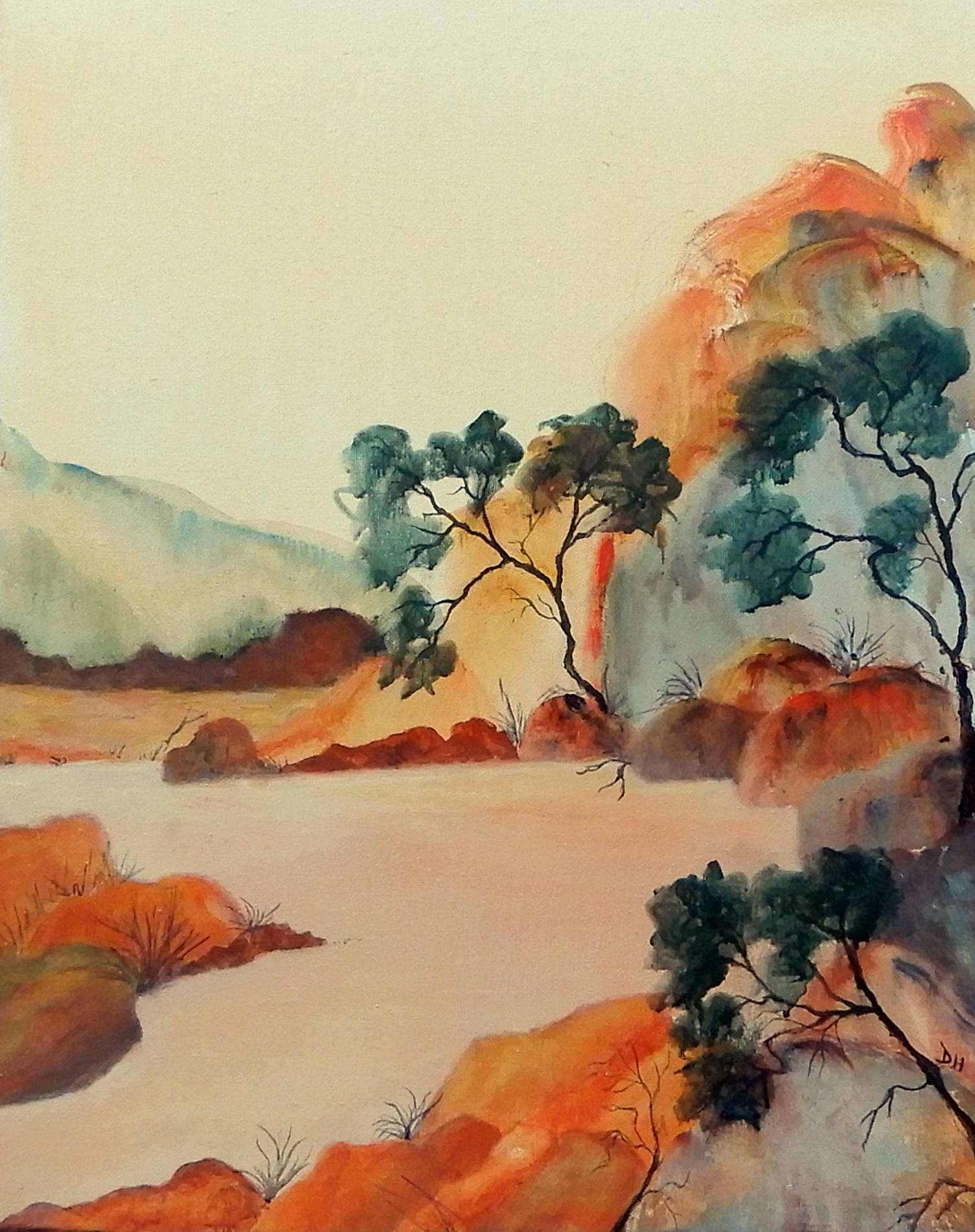 A creek in the Red Centre under a pale sky painted in gorgeous warm tones. This painting has many coats of gesso, giving an almost watercolour transparency to the surface.