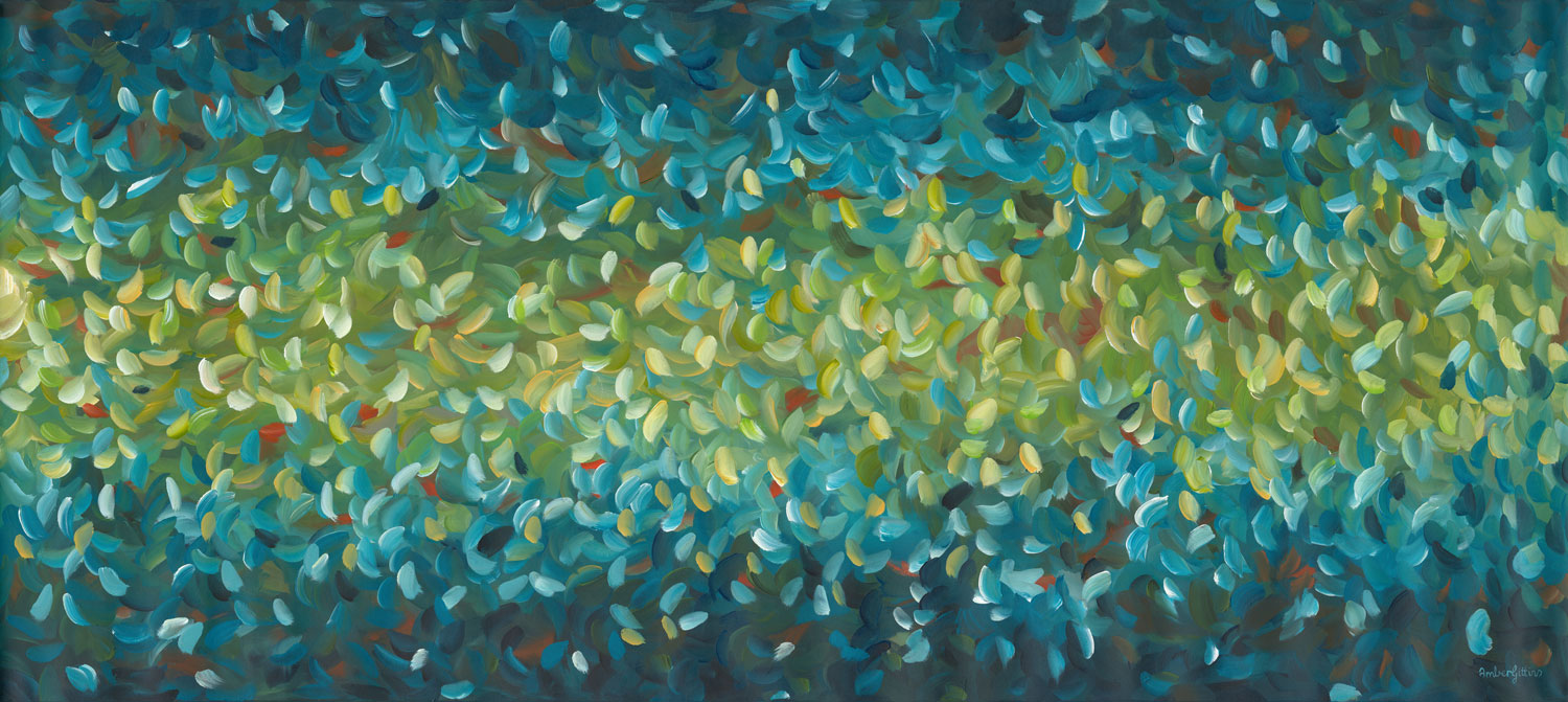 Along the River – I painted this stunning large river inspired abstract painting in a modern impressionist minimal style. Inspired by the colours of an Australian river and the glistening sunlight on the flowing water. A stunning colour palette of dark to light blues, greens and yellows with pops of orange red in a flowing calming rhythmic pattern.