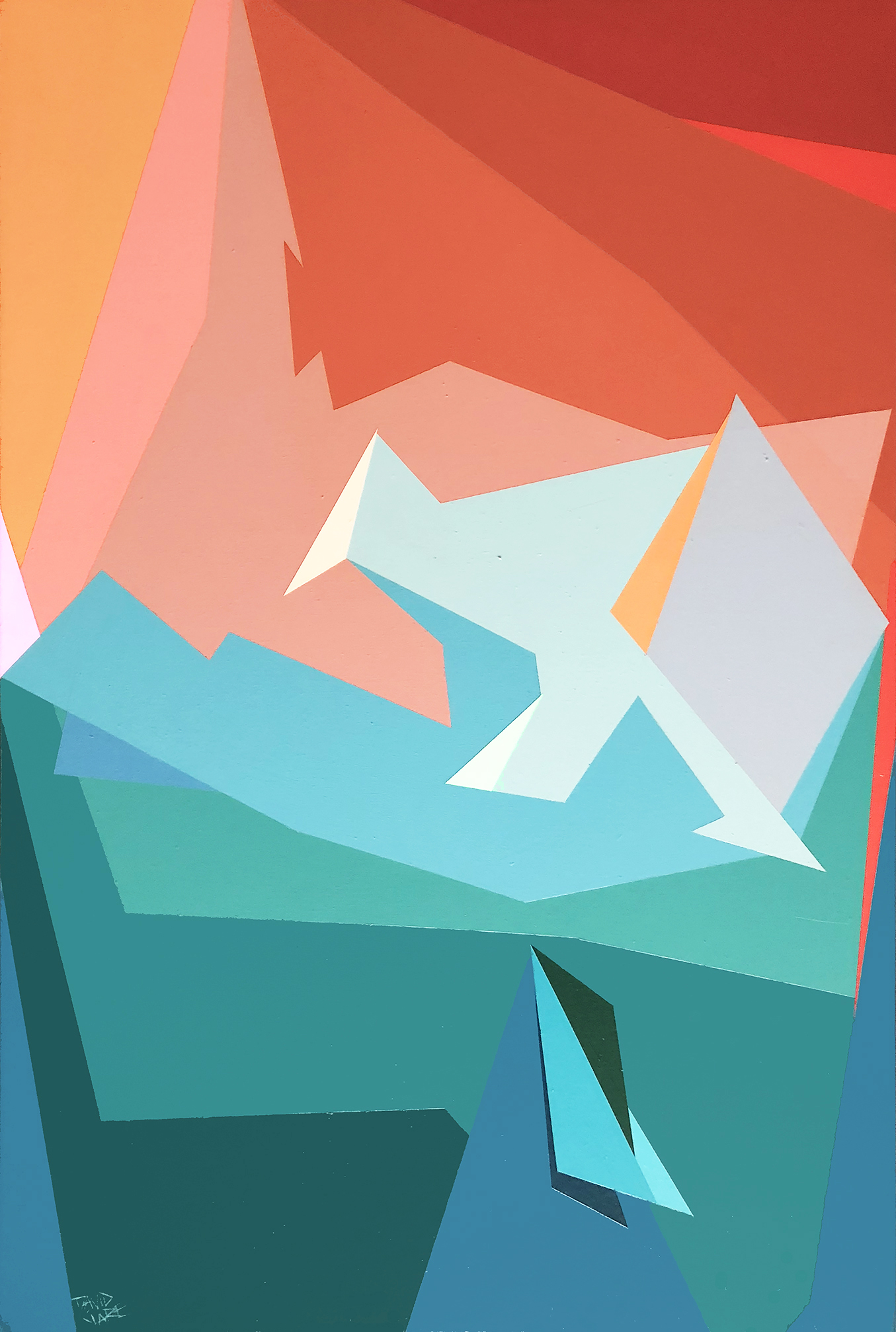 This painting is designed first on computer, then re-created, and added to with paint on canvas. Angled coloured shapes creating an abstract icy mountain range with a sunset.
