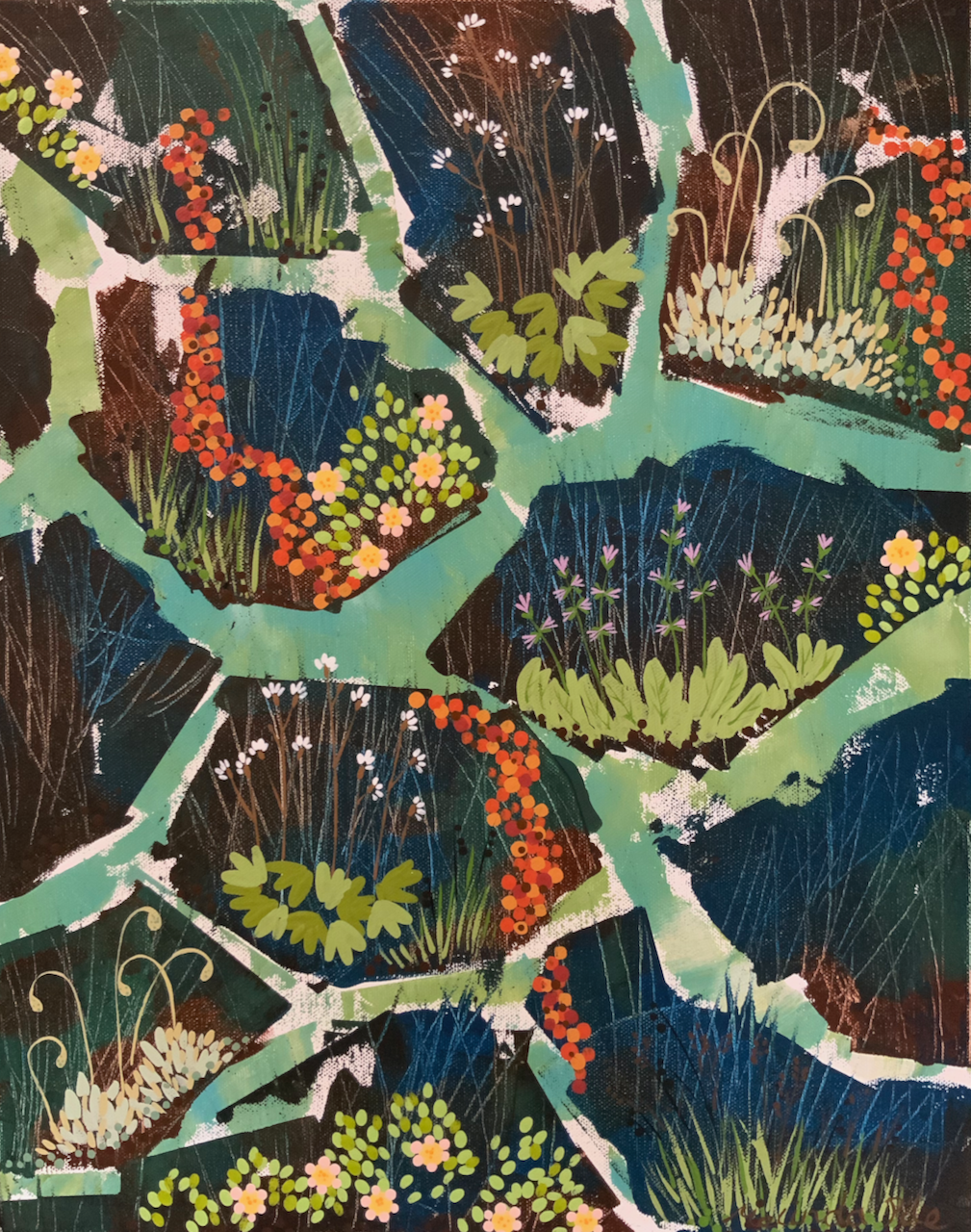 “Alpine View” is the next artwork by Melinda Pile. Melinda is constantly inspired by her (not so tidy) garden including the insect and bird life and the abundant trees and flowers. This painting is inspired by tiny alpine plants that Melinda loves but finds impossible to grow. The intricate detail and the rock forms build a miniature wonderland.