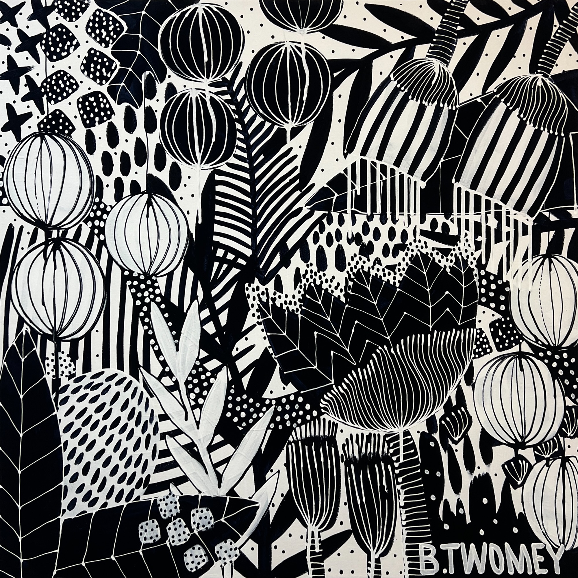 Abstract botanical painting by Australian artist B.Twomey featuring flowing organic forms and layered textures in black and white created to evoke movement, joy, and connection with nature.