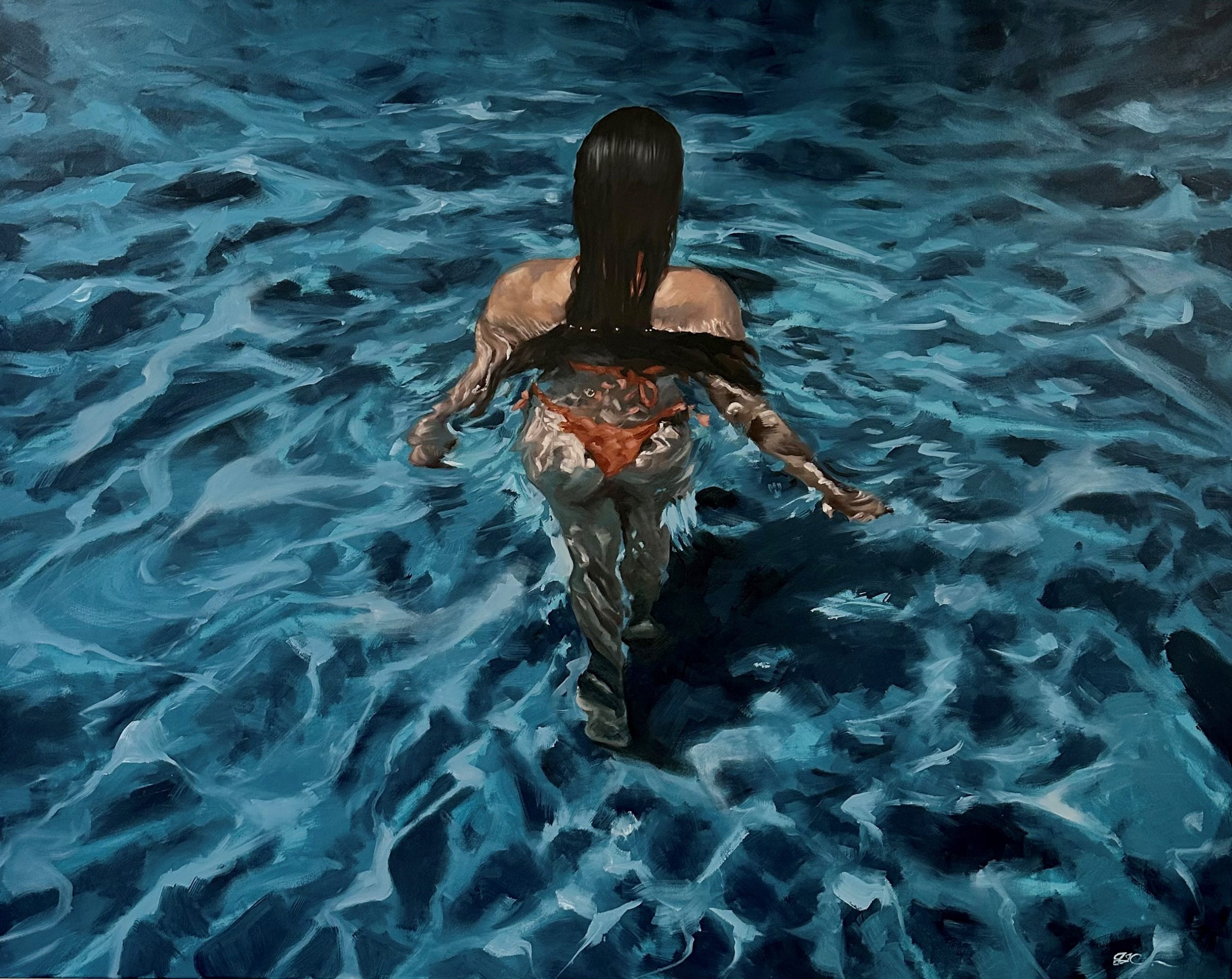 Always by Amanda Cameron – is one of a new series called ‘Salt Water’. While still exploring the interaction and connection between water, light and form, this series also analyses the sense of disquiet when swimming in deep ocean water. At the same time, the main focus is the quest for refuge, quietness and escapism. These paintings juxtapose the lone swimmer and a few minutes of introspection when alone in deep water against the fear of the unknown. The constant struggle between hyper-realism and having a painterly quality to my work is a conflict that I am always trying to balance; therefore, thick paint and evident brush strokes are present when viewed up close. This piece is painted in professional oil paints on a museum-quality canvas and finished with edges painted and varnish for protection. It comes ready to hang and includes a certificate of authenticity.