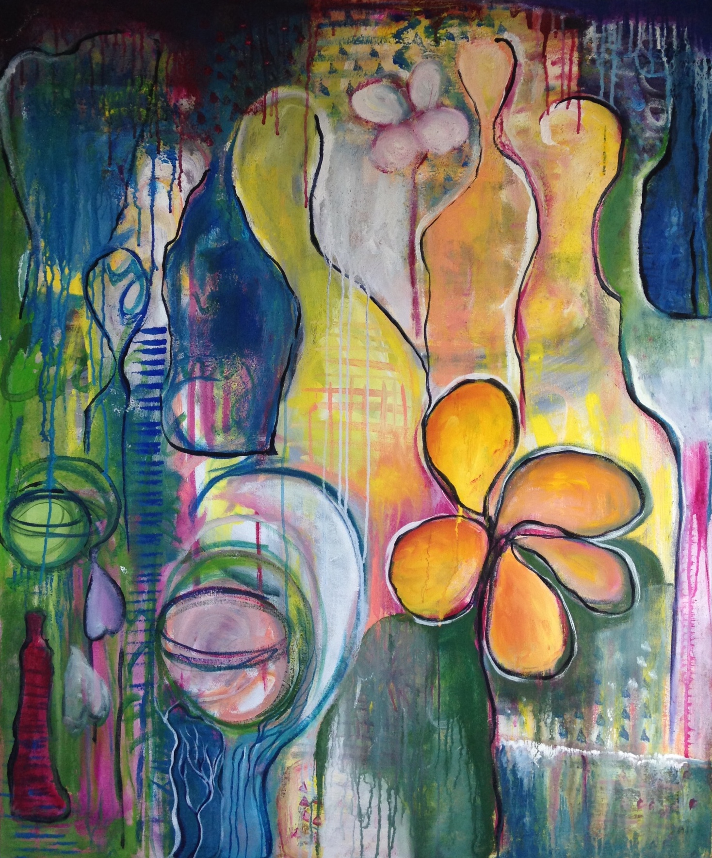 Coming from Europe we were always looking for the sun, a place to get a tan, to relax and feel warm. Here in Australia it’s different now with too much sun and heat. However I am still loving the sunny days and so this painting is about that feeling and when the sun is out and my music is playing I dance over my canvas letting my feelings go and feeling free with colors, lines, shapes and paint.