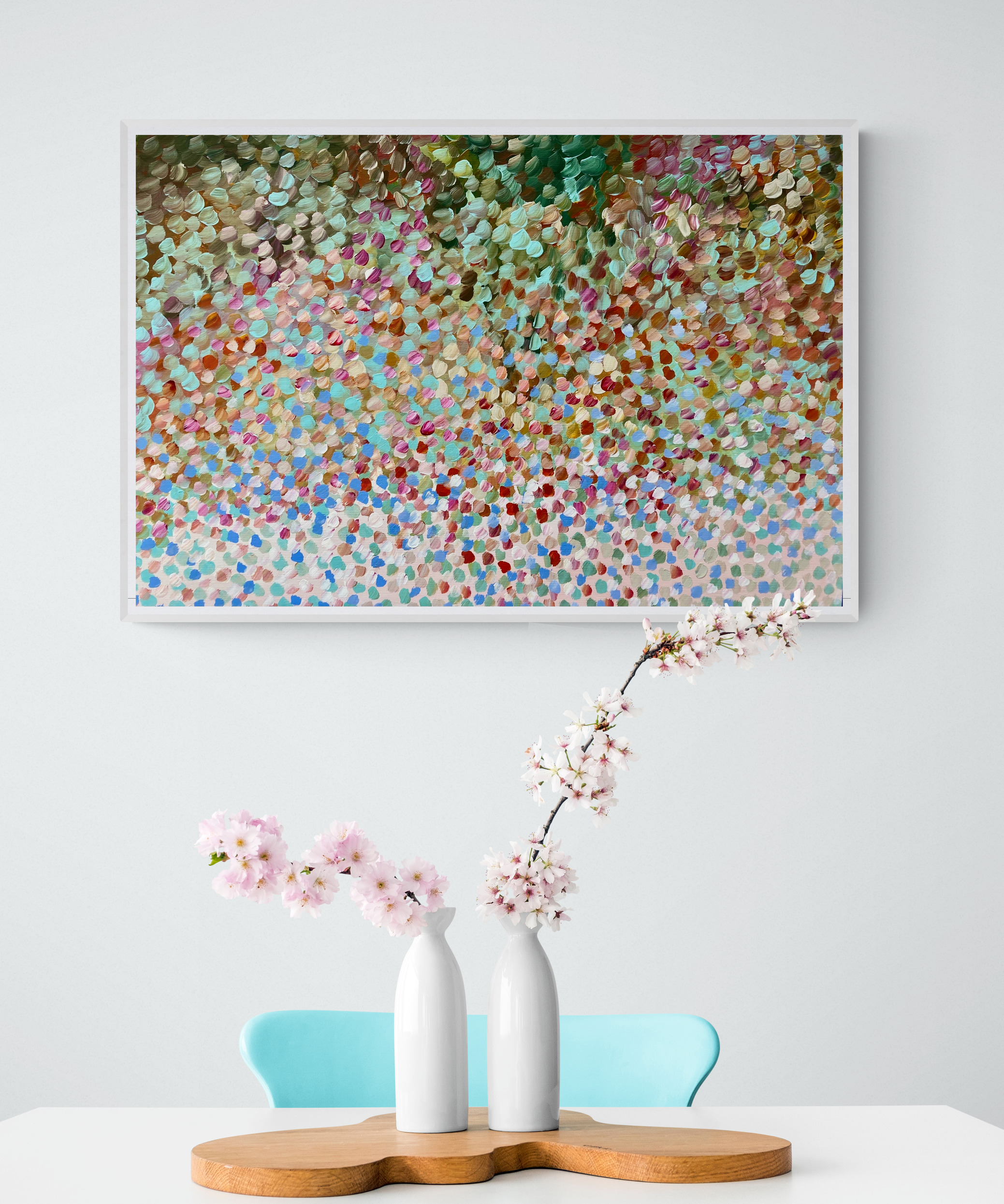 Always Yours by Theo Papathomas a painting with earthy colours of the petals flying in the wind creating this beautiful carpet of petals in the landscape with lots of layers of paint. Beautiful flickering petals dancing over the land shining like stars. Petals weeping onto the landscape creating this veil of petals covering the landscape with beautiful warm and cool colours . A composition of colours and rhythms of petals dancing like musical notes over the land . A very peaceful and tranquil painting with so much depth. The painting does not come with an external frame.The painting is signed and dated 2021 at the back and comes with a certificate of authenticity.