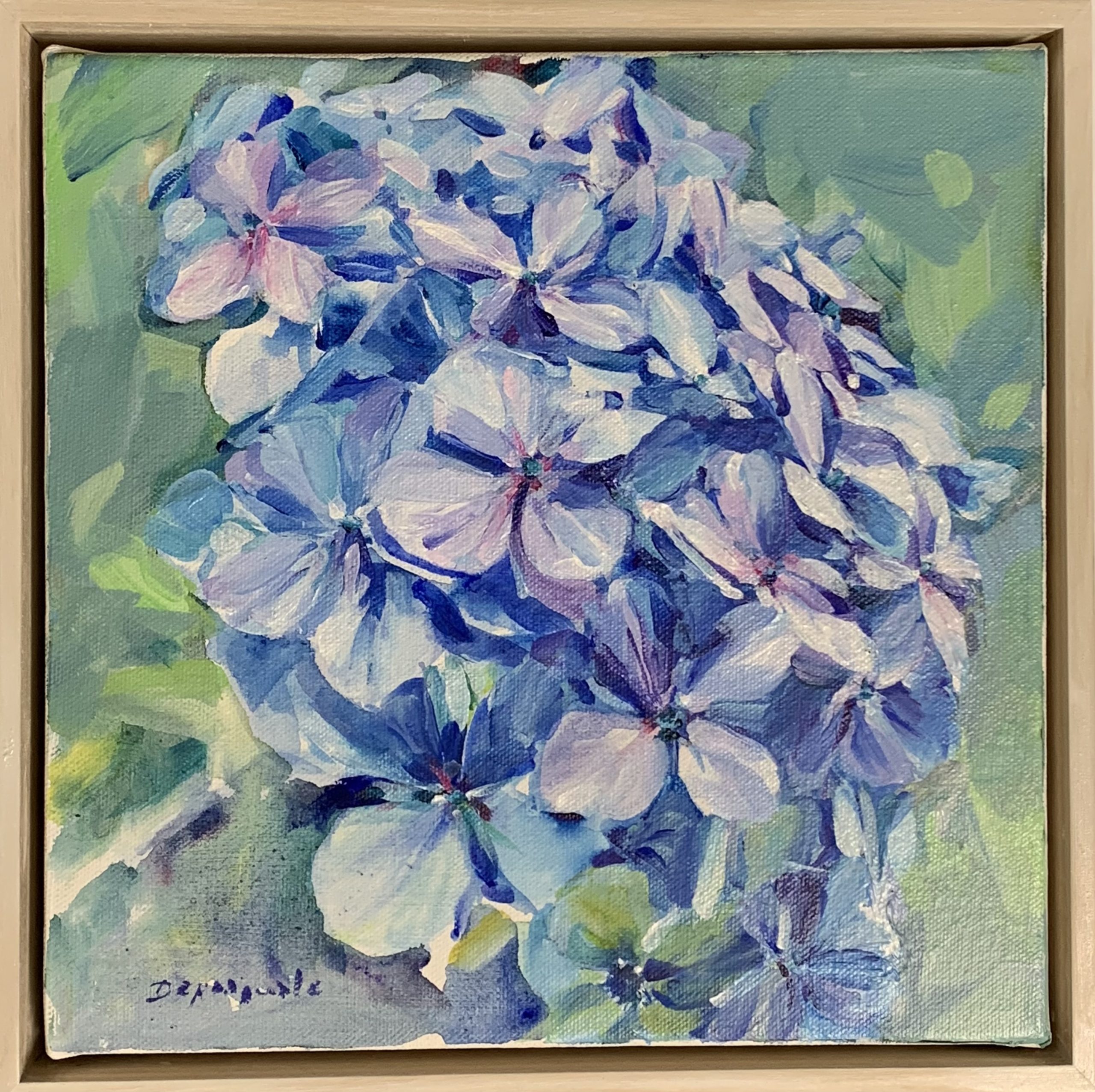Faye De Pasquale is a small acrylic on wide sided canvas, framed lovely light coloured Tasmanian oak box frame.