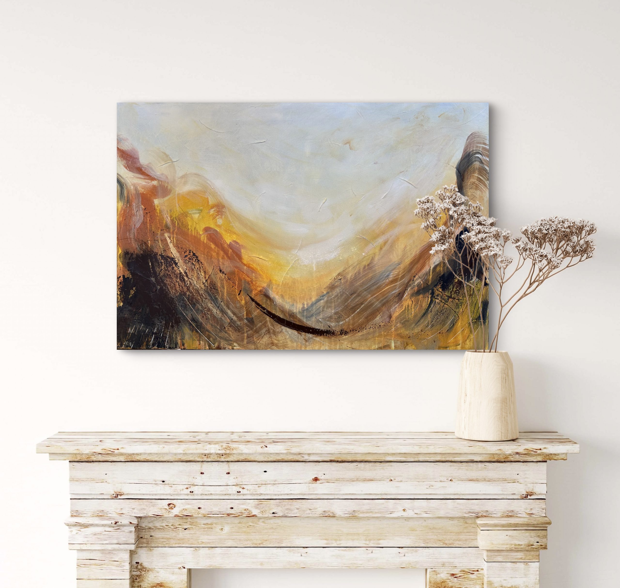 This painting is an abstract landscape inspired by the earthy shades of warm sienna and ochre.