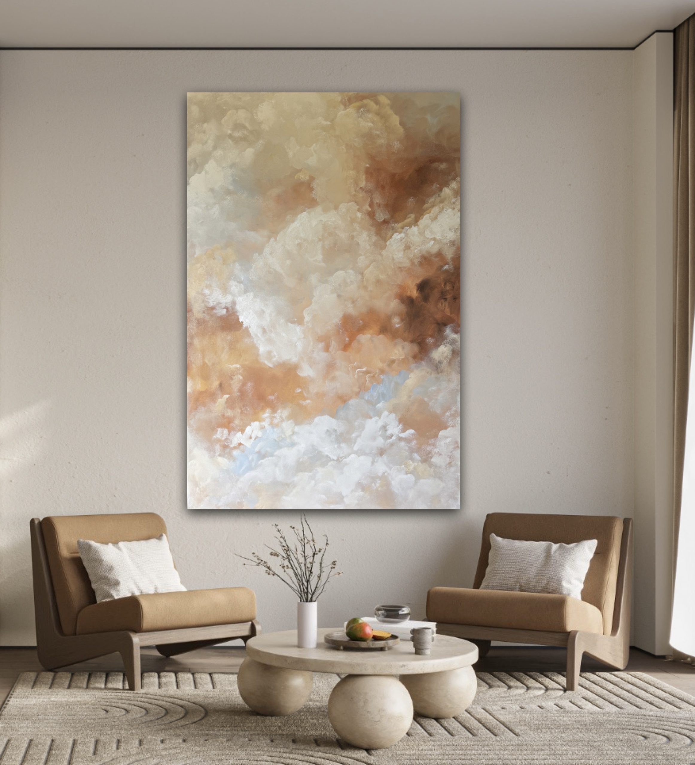 A soft, atmospheric abstract piece that blends warm earthen tones with gentle, luminous highlights. Hints of caramel, sand and muted sky blues melt into each other forming a dreamy horizon that feels both grounding and calm.