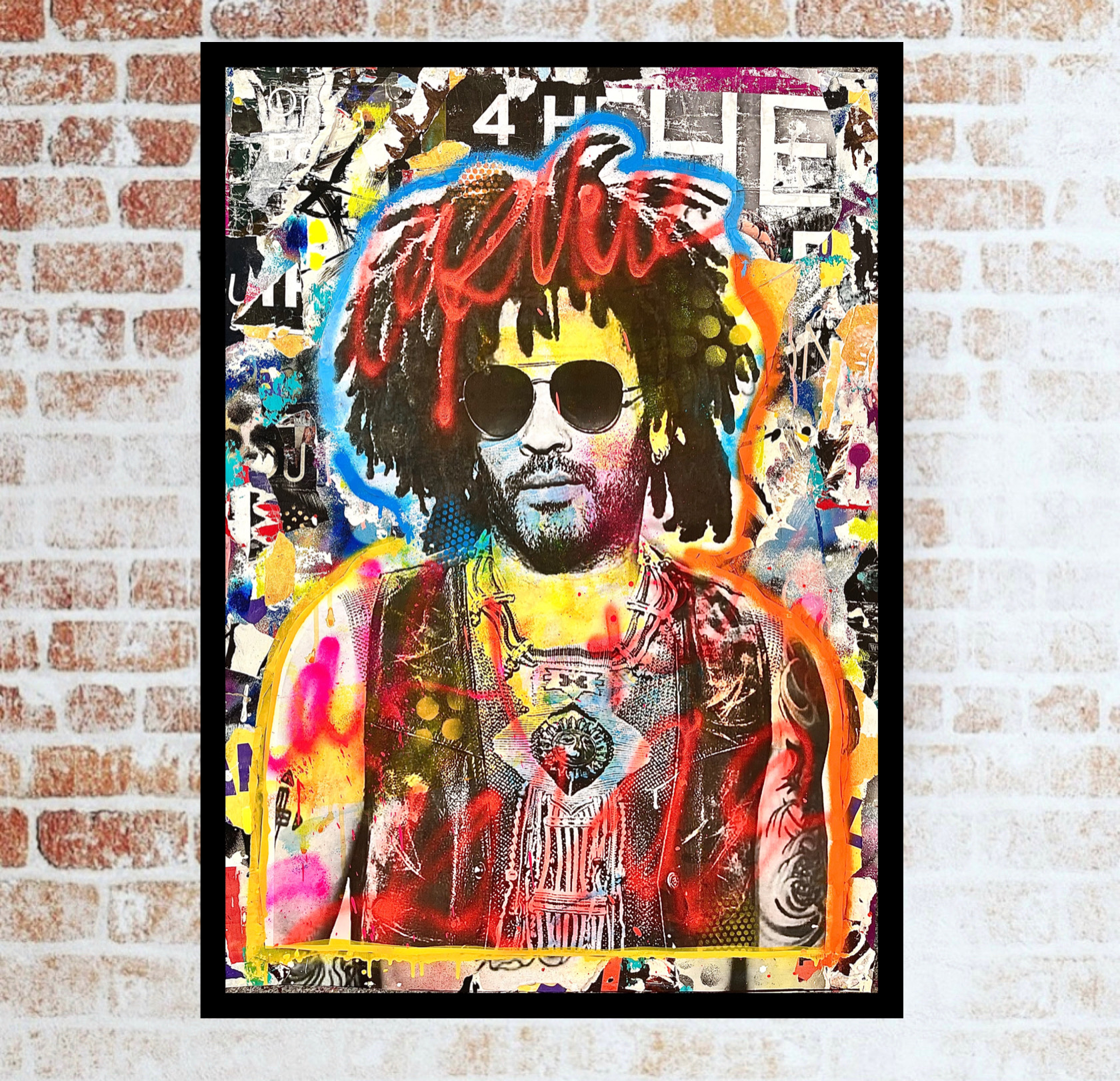 The main Image of rocker Lenny Kravitz was then added and then further overlaid with lots of layers of paint and street posters to give a worn rustic appearance.