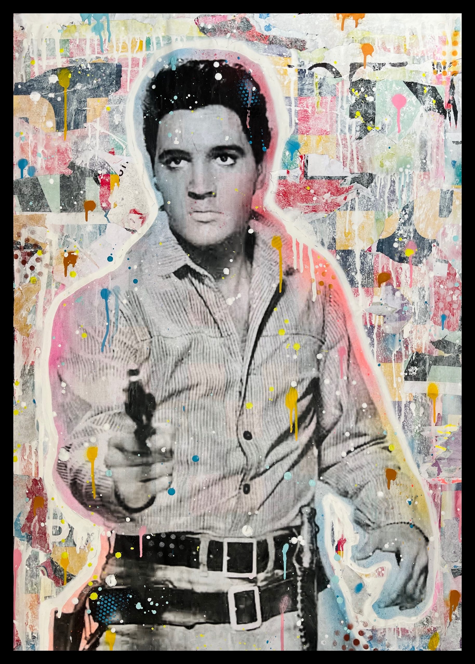 The main Image of Elvis was added and then further overlaid with lots of layers of paint and street posters to give a worn rustic appearance.