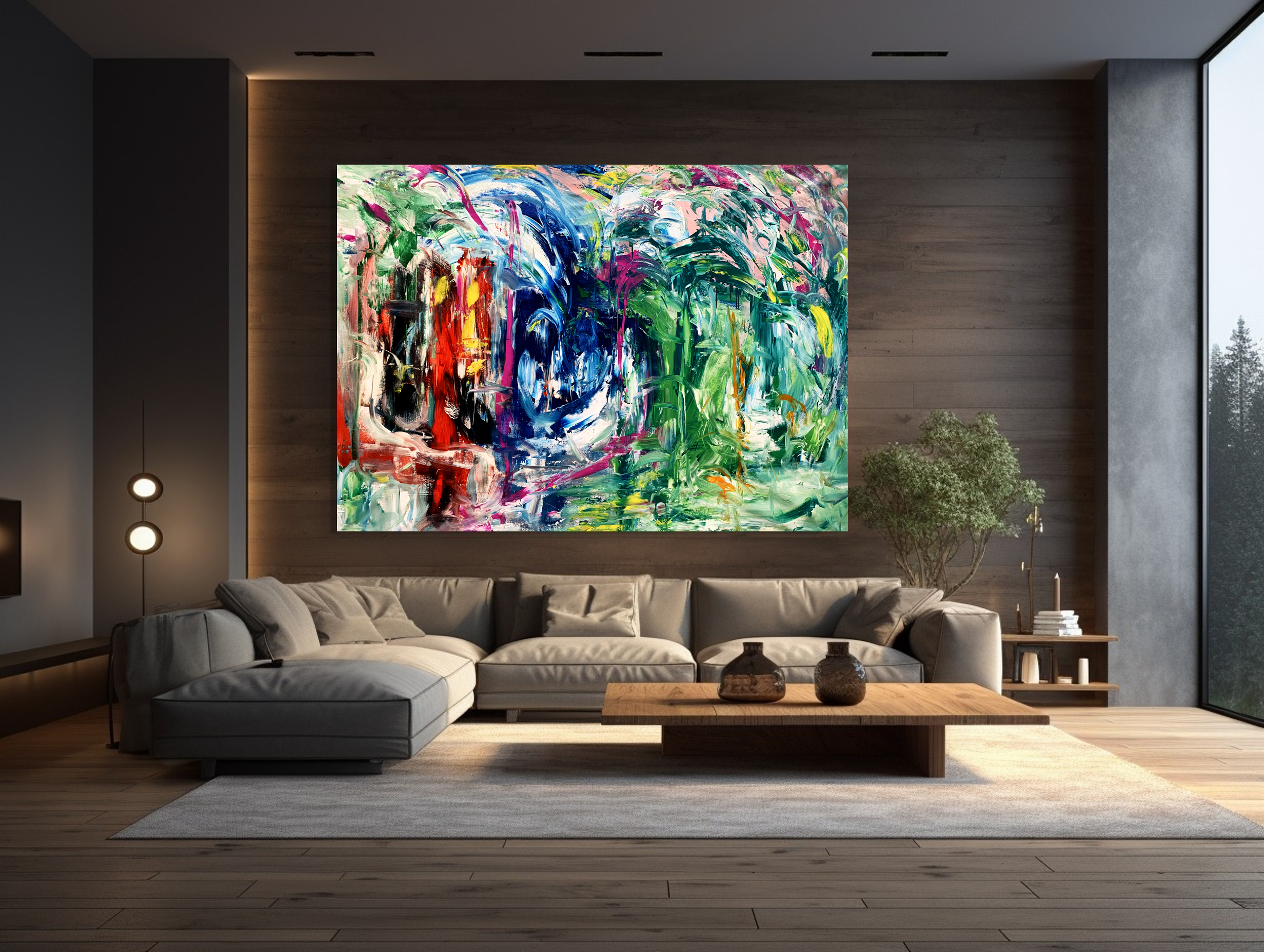 This work is painted with synthetic polymer acrylic and the surface is a professional-grade 12 oz canvas and has been sealed with varnish. The canvas is stretched onto an HD stretcher with dimensions 198.1 cm in width by 142.2 cm in height. The painting is painted in the same manner on the sides, so there is no need for framing.