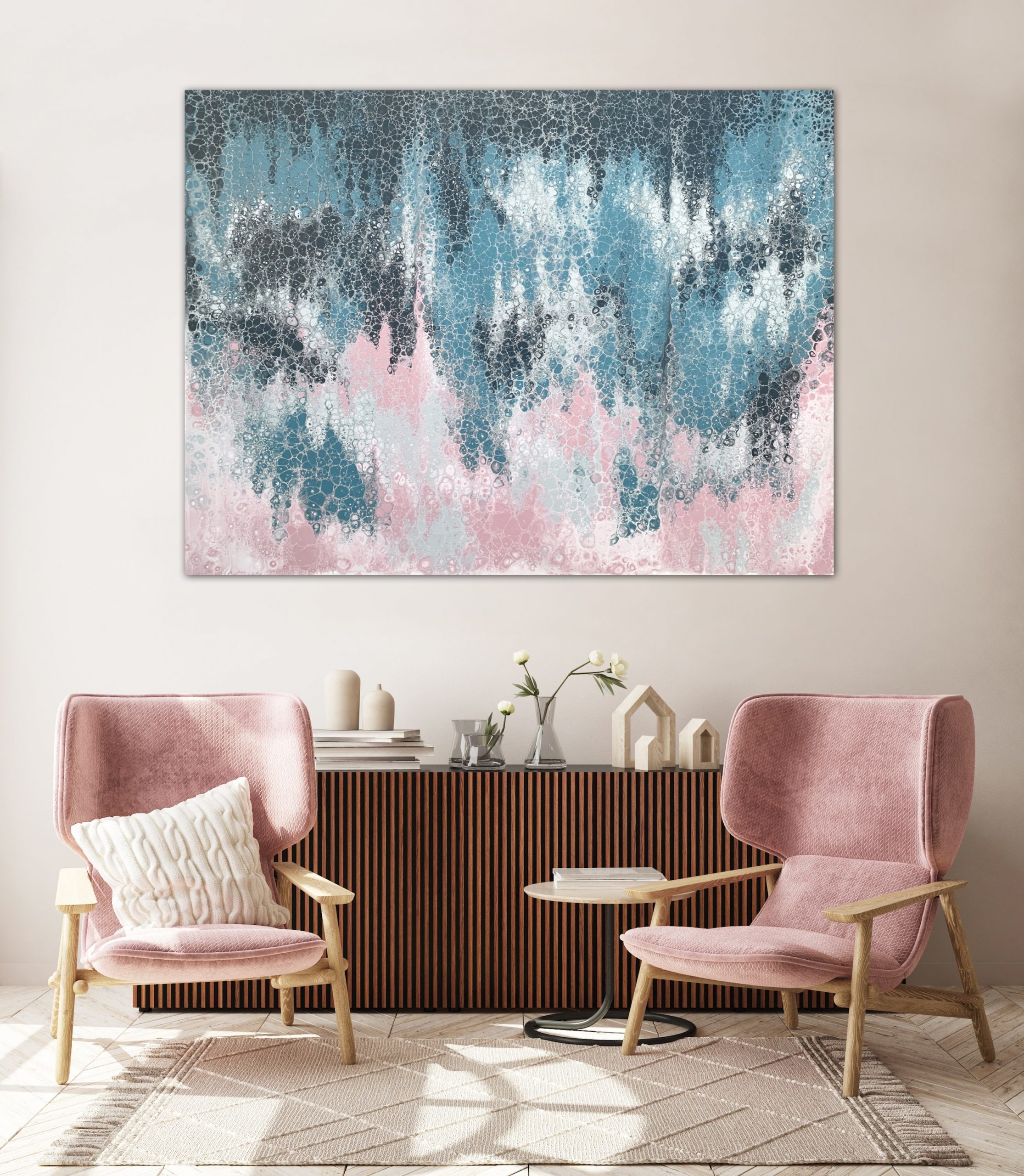 Amidst was created using various techniques combined to allow increased flow, interaction and separation of colours to create interesting patterns where pops of colour can be seen emerging from underneath. This added dimension adds lace and cells to the artwork creating an interesting and one of a kind painting that can never be replicated.