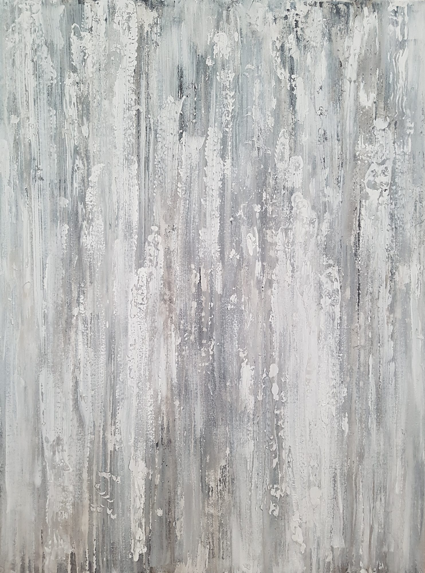 Muted minimal tones of grey, winter white, light silvery taupe, charcoal and black along with varied pattern, seek to echo it’s unique enduring beauty. Lightly textural, this work holds interest in daylight and also more moody night time lighting. Among The Ghost Gums has a calming, gentle presence within the room.