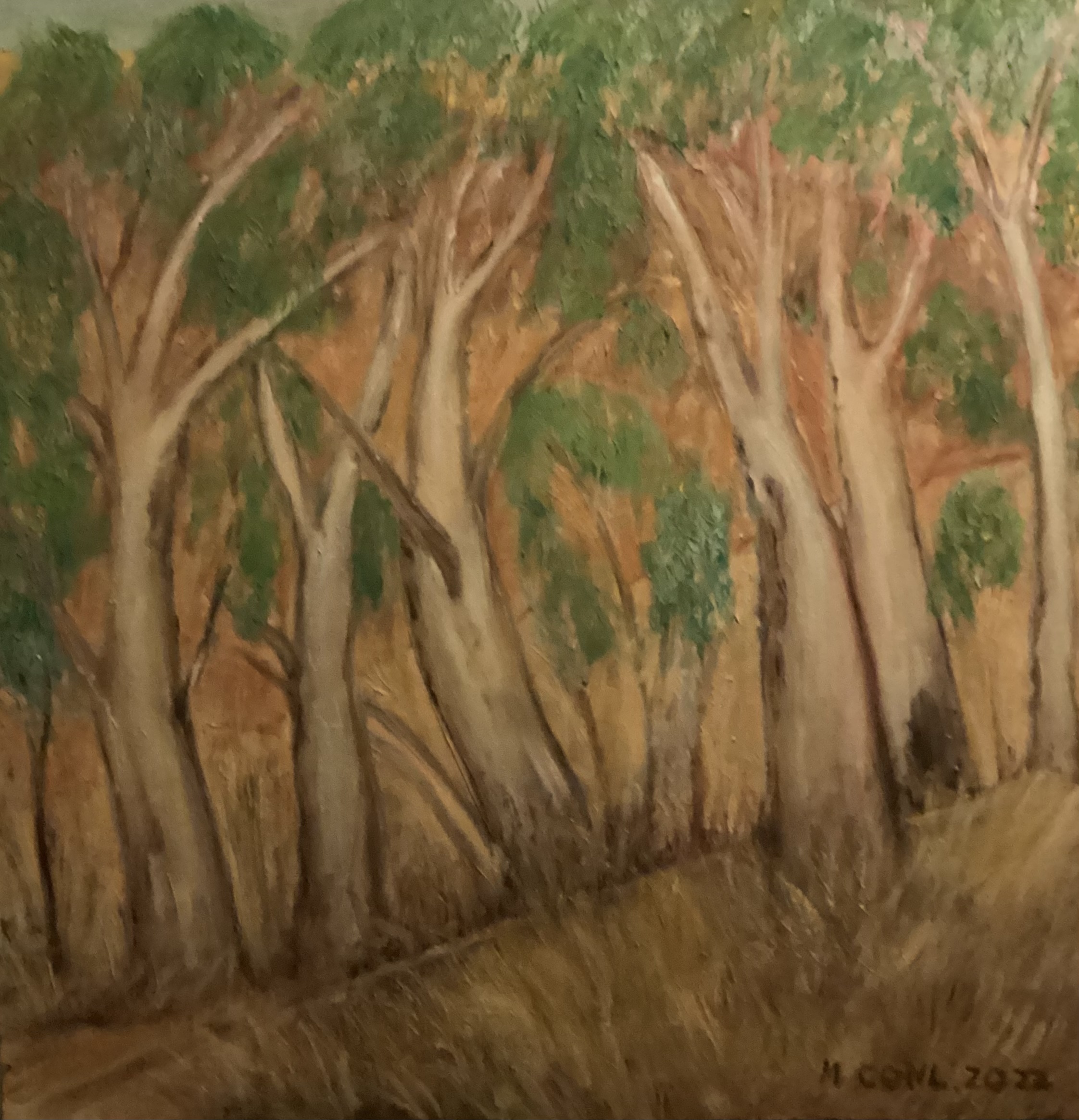 Among the gum trees – Original painting by Margaret Connell. Quality oil paint used on a professionally stretched canvas that is primed .Ready to hang .The painting has been sealed.This painting has been inspired by Margaret’s experience of wandering in gumtree bush land and her love of the use of colour to create a sense of the warmth of such an experience in summer.The painting is warm and has a sense of lightness and air. It would be ideal for hanging in a home and would lift a room.