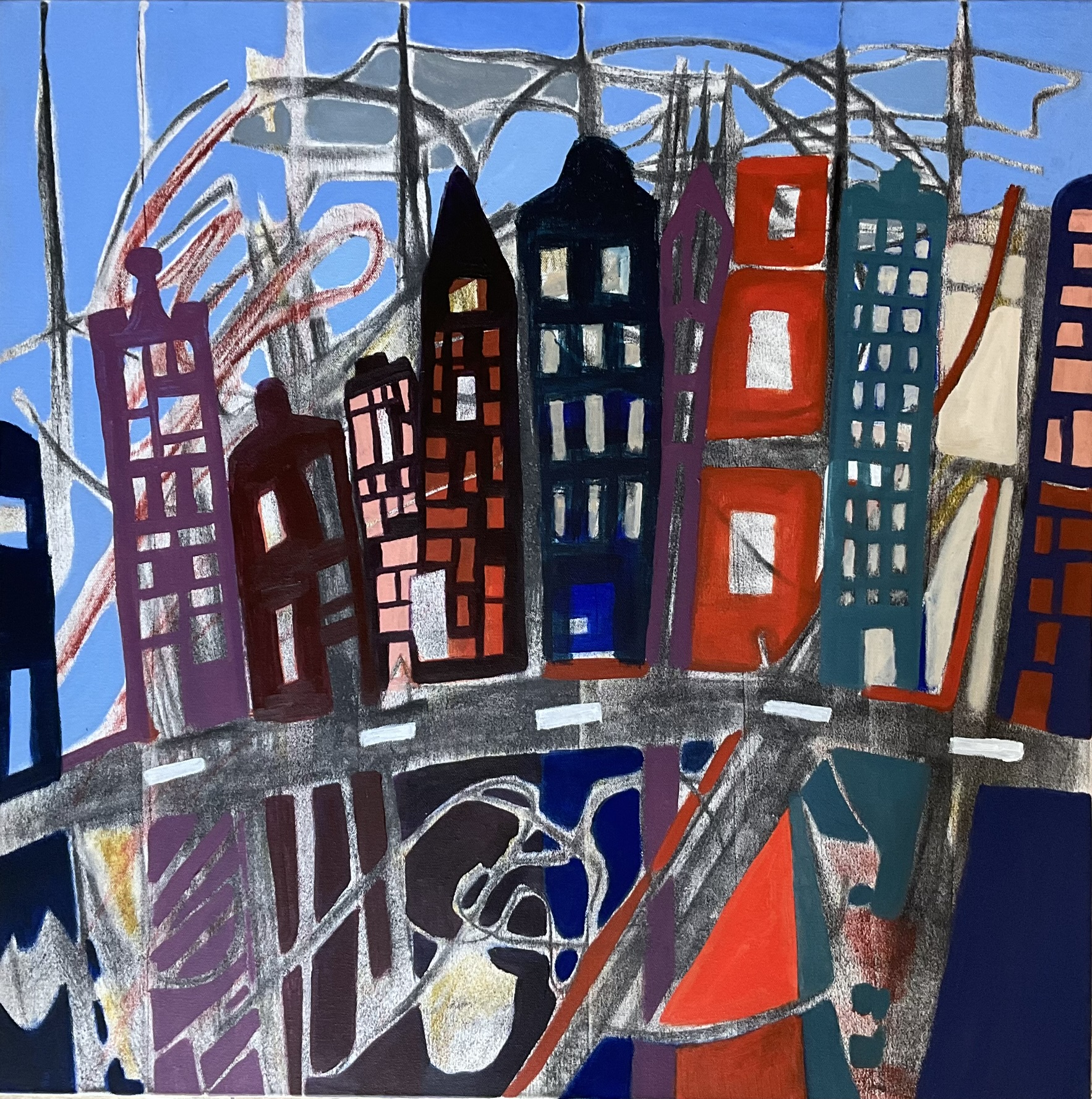 The painting was created with complementary colours, lots of charcoal and ArtGraf. It has been sealed.