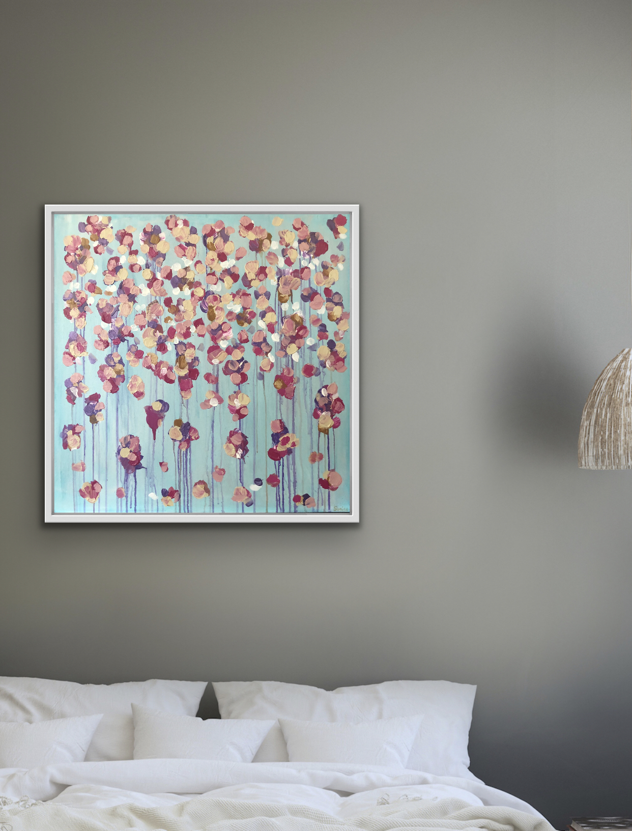 66cm by 66cm with painted deep edges, varnished in satin for protection and luster, has d-rings and wire to hang.