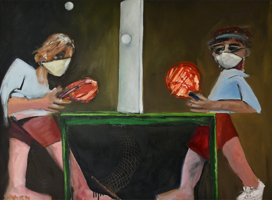 Inspired by real events. That intrusion to free human interaction. The acrylic shield. That’s all very well but try playing table tennis. The net, a small, flexible permeable symbol of separation is now replaced by an impenetrable transparent wall. The rise of alienation and frustration in the player, as each ball ricochets. I wished to use the concept of the game, to show how we had shifted our social interactions into spaces of guarded suspicion.