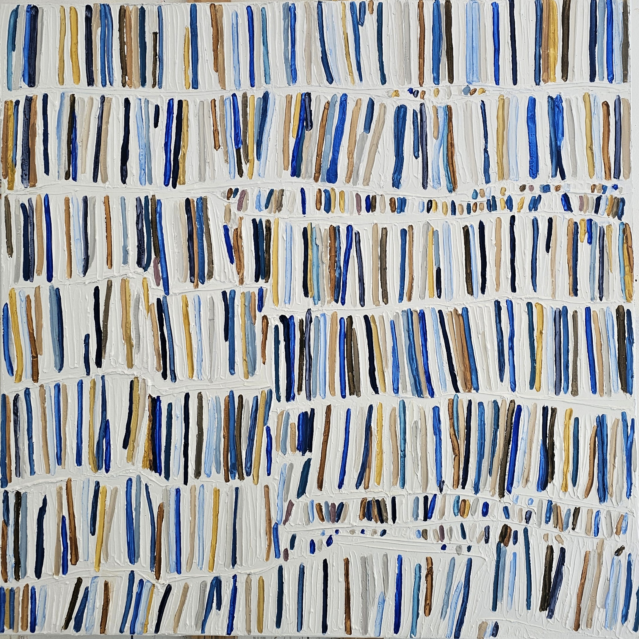 ‘An Unforgettable Summer’ by Virginia Hendren is a large original painting using textured medium and acrylic paint. A beautiful one-of-a-kind piece with lots of delicious hand painted detail. With a trending colour palette of blues, tan, ochre and neutrals, it has serious visual appeal when insitu on a wall.