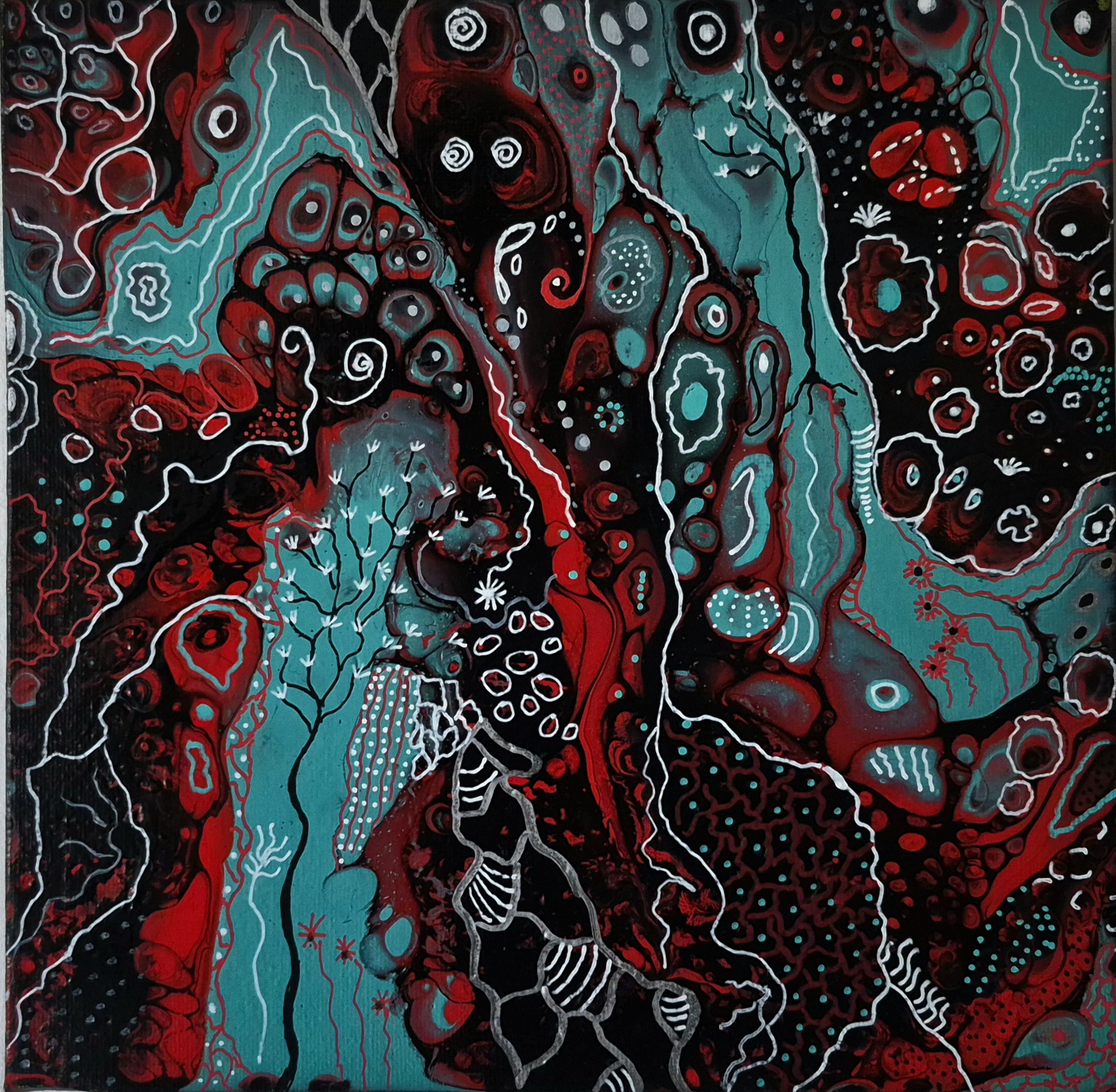 Base acrylic Paint Flotrol and silicone top design acrylic paint and posca art pens. Artwork on stretched canvas