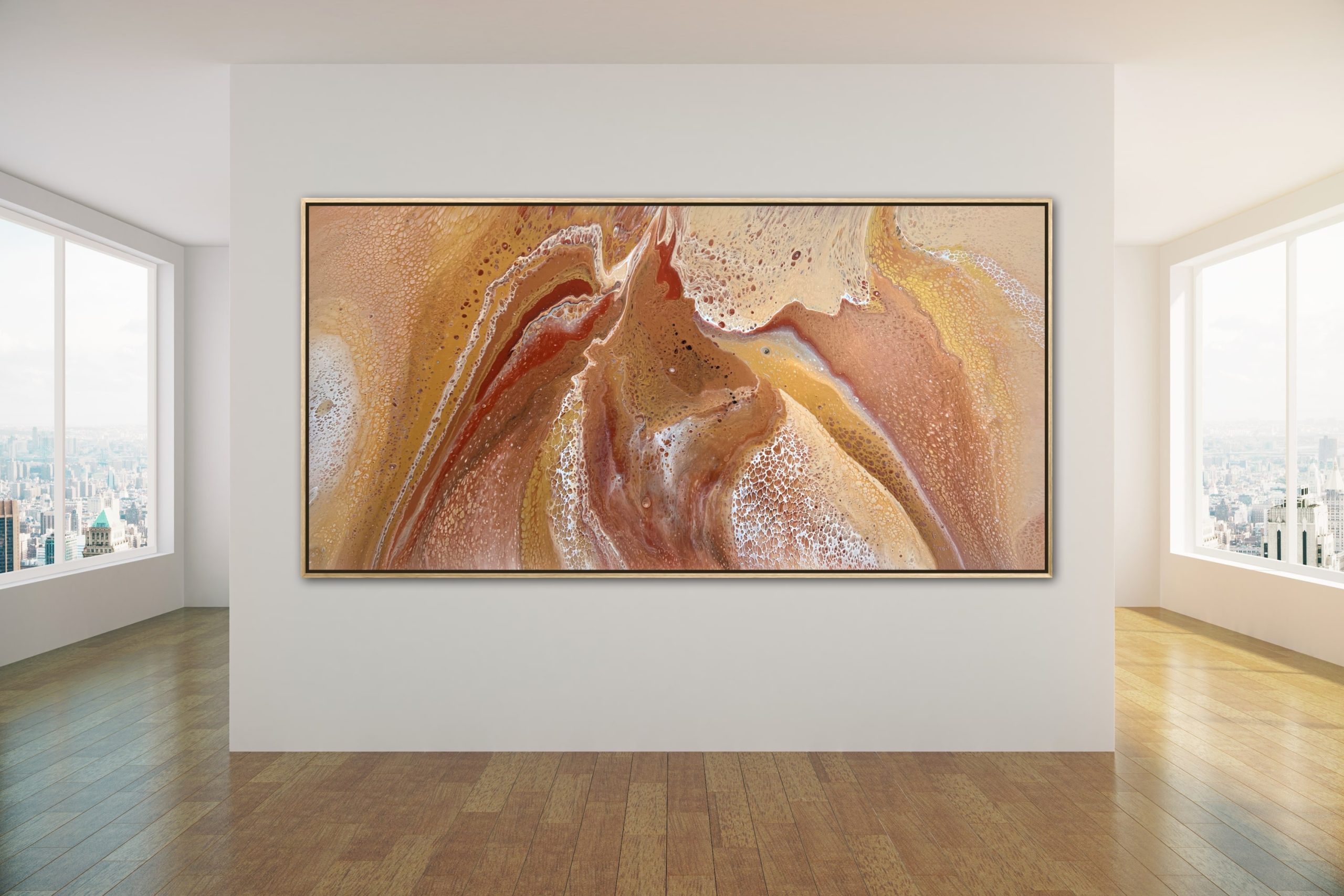 Ancient Forms was created using various techniques combined to allow increased flow, interaction and separation of colours to create interesting patterns where pops of colour can be seen emerging from underneath. This added dimension adds lace and cells to the artwork creating an interesting and one of a kind painting that can never be replicated. A gorgeous variety acrylic pigments were used including metallic yellow & rose gold, bronze, copper, cream, silver, black and white.