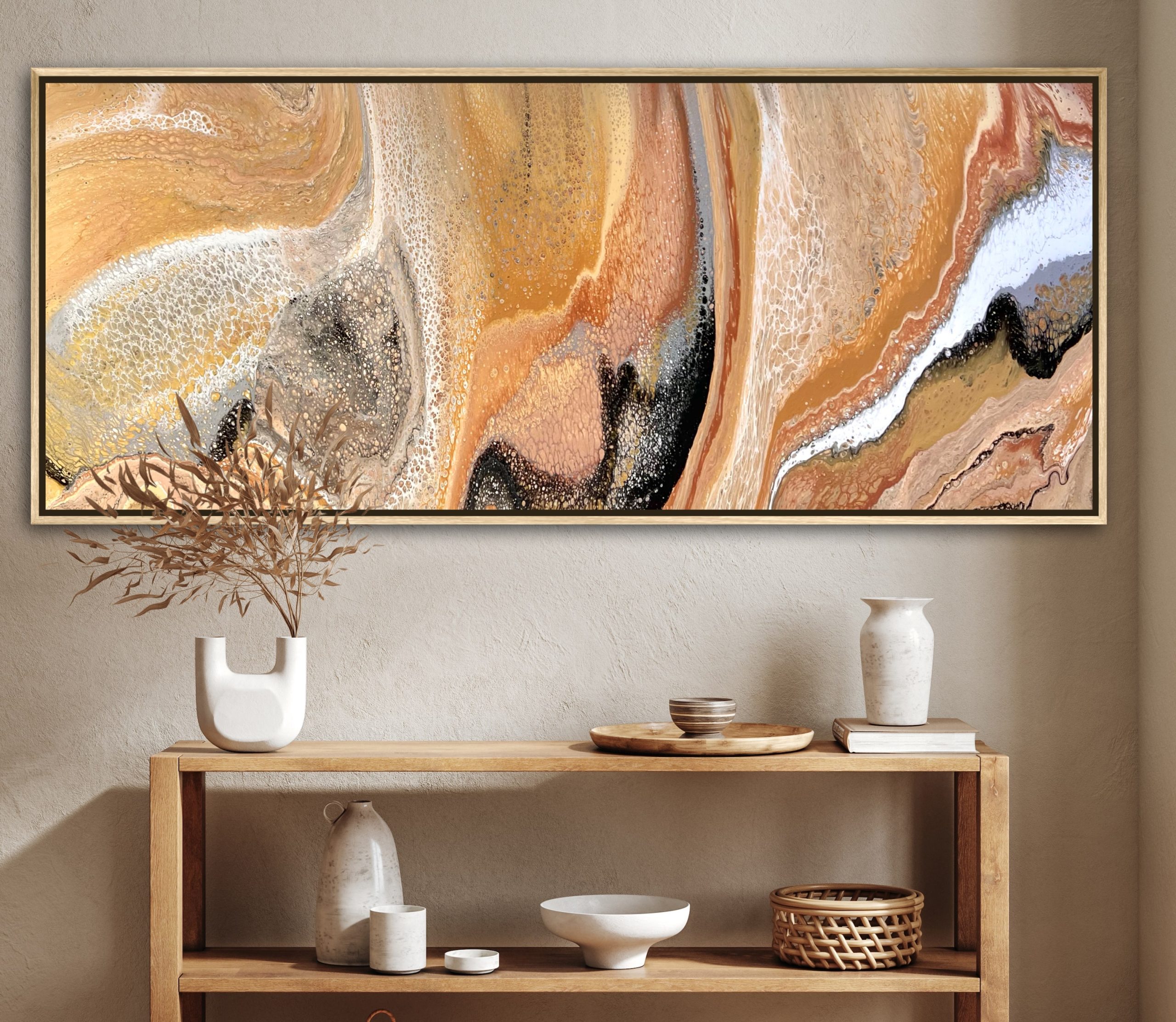 Ancient Layers was created using various techniques combined to allow increased flow, interaction and separation of colours to create interesting patterns where pops of colour can be seen emerging from underneath. This added dimension adds lace and cells to the artwork creating an interesting and one of a kind painting that can never be replicated. A gorgeous variety acrylic pigments were used including metallic yellow & rose gold, bronze, silver, cream, copper, grey, black and white.
