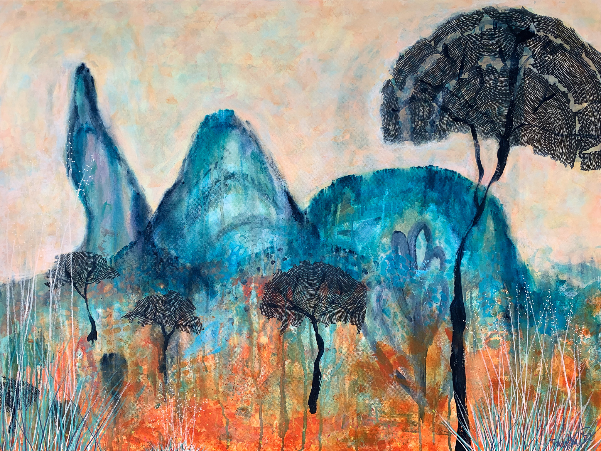 Inspired by the colours and landscapes of Central Australia, where, when you get quiet and listen, you can feel the thrum of thousands of years of existence. Ancient Thrum is from a body of work painted in response to camping trips in some of the most remote parts of Australia, and an attempt to make the invisible spirit of these places visible.