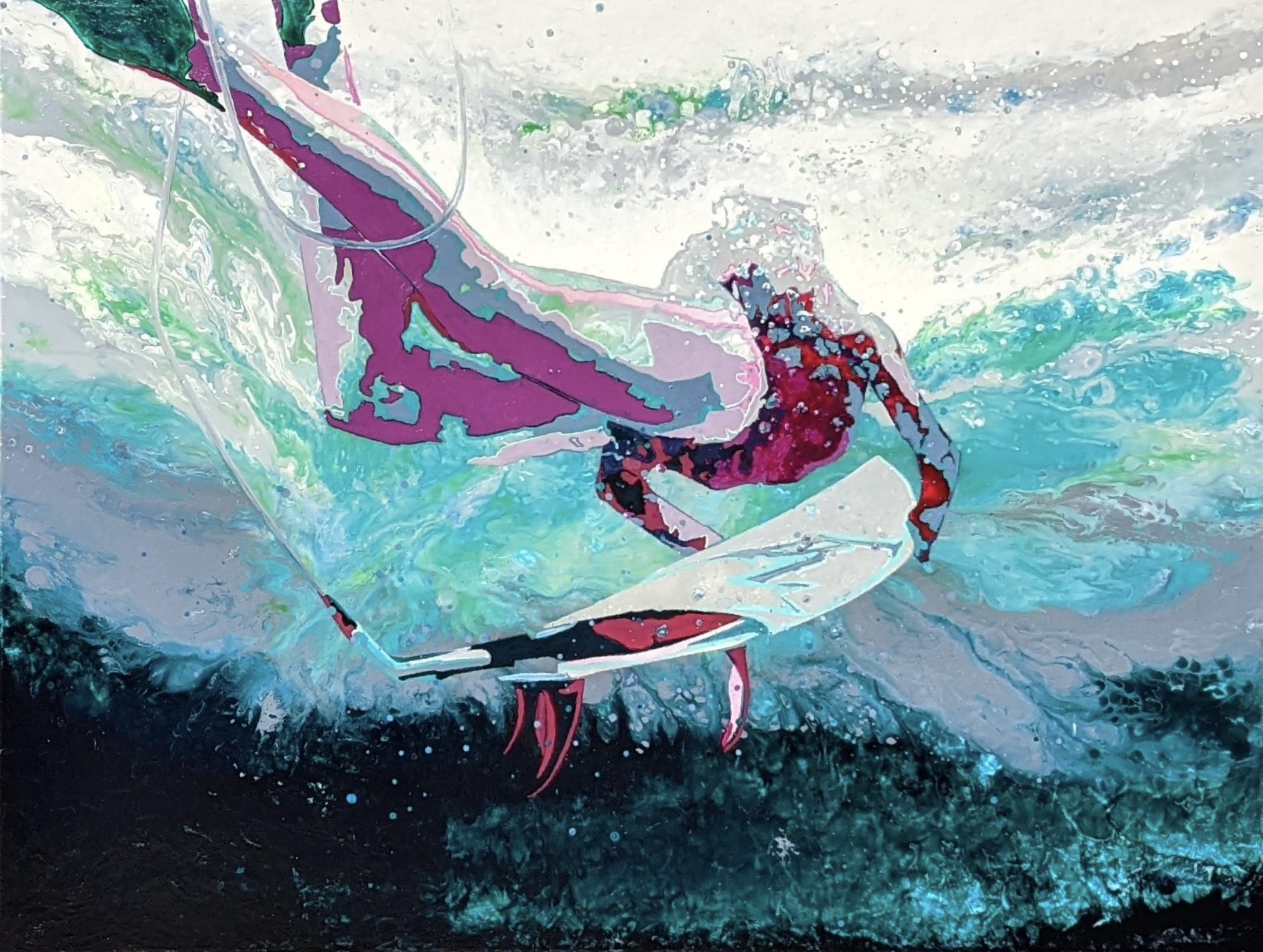 I work from created and found photographs and film stills, and I captured this image from a film still of the unofficial film clip for the Odesza song “Sun Models ft. Madelyn Grant” – one of my favourite songs to listen to in the studio whilst painting. I wanted to capture the youthful and freeing feeling with colour and movement as the surfer girl duck dives under the surface in the swell and bubbles. To do this I’ve used contrasting colours in teal and magenta along with the cool greens and ocean blues of the background. In this rectangular composition of an underwater world, the light highlights her head as she rises to the surface. I have developed my style using contemporary art techniques such as expressionism and pop art.