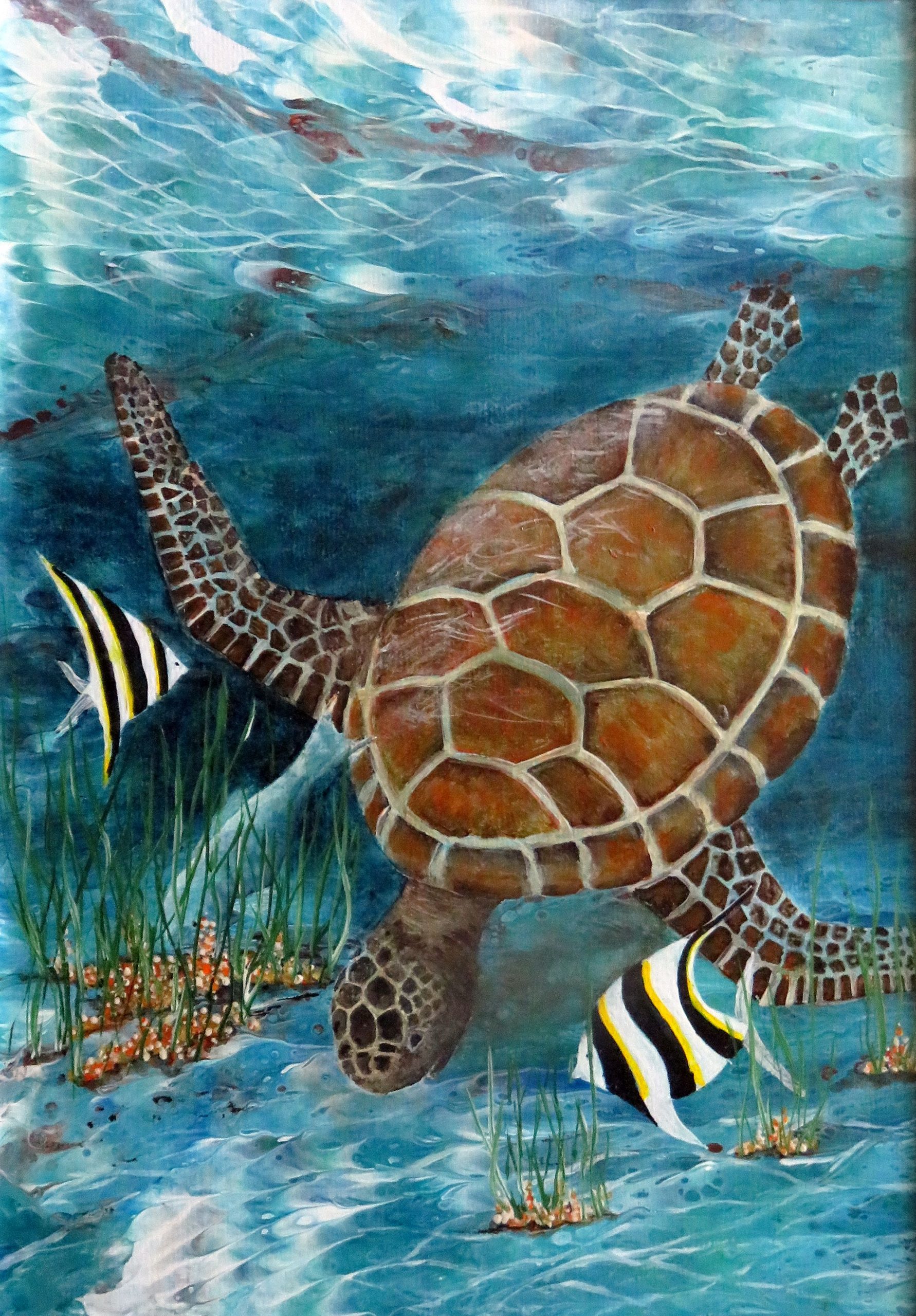 This original painting ‘And There You Are’ started with a fluid acrylic pour with the colours of the ocean on a 29.7cm x 42cm (A3 size) 300msg acrylic paper. After the pour had completely dried, it was embellished with a swimming turtle.searching for food on the bottom of the sea.