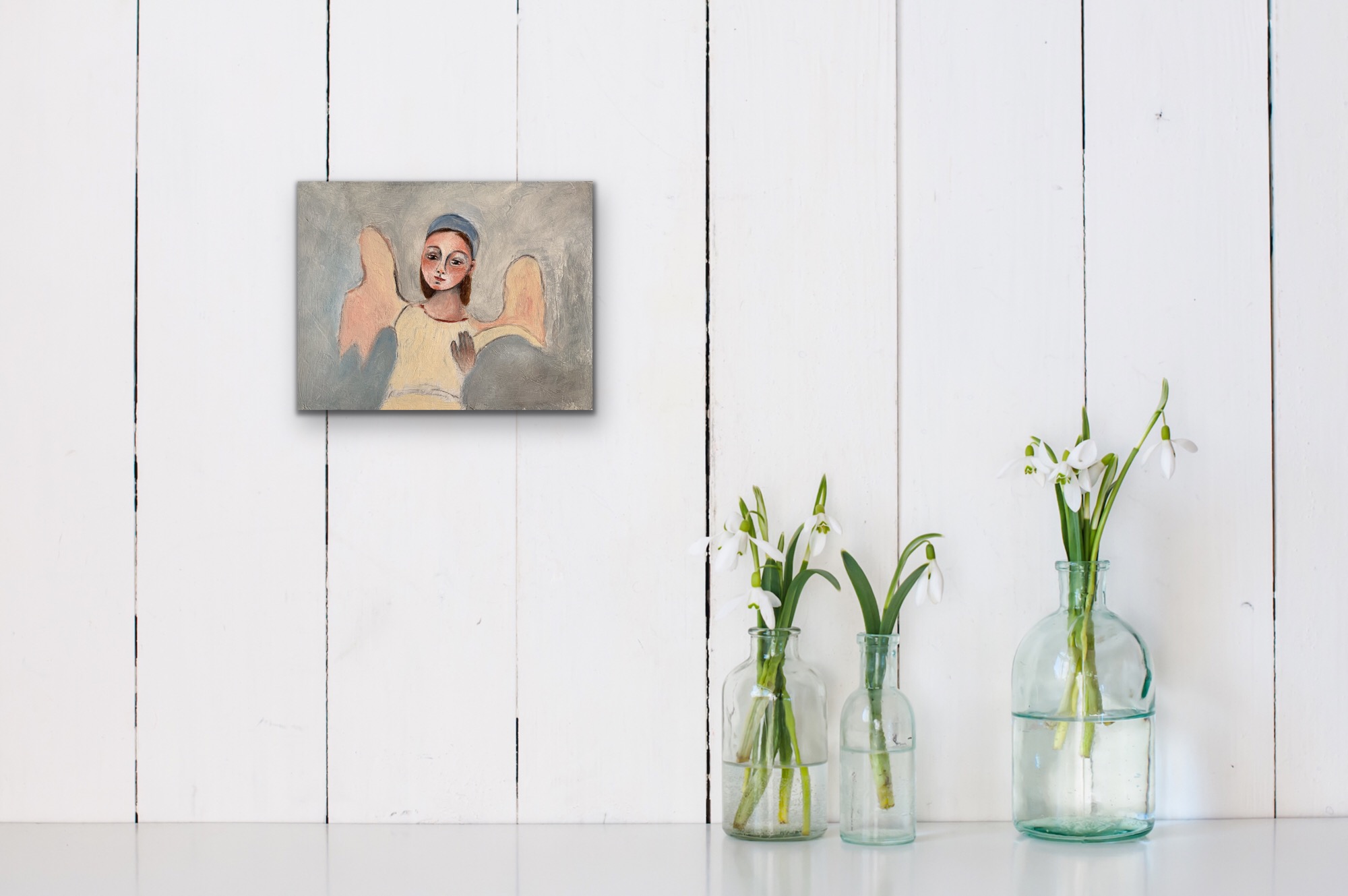 Angela numero uno, original mixed media work by Marijke Lambregtse is inspired by my travels for six months through Italy. We stayed in Bevagna for three months, a tiny village in Umbria and close by was the lovely very old town of Foligno where we visited this gorgeous church, more like a Roman temple. I saw these dilapidated frescos with bits and pieces left from angels on them. Absolutely beautiful! So these were the starting point for some little artworks. The faces became quite hot and warmly tinted which is how I felt in the ongoing heatwave we experienced during our stay. I used recycled teabags for texture and layering and pencil, pastel and acrylic paint. Mounted on a deep etched birch wood artist panel it either can be hung or stand up on a shelf. Sides can be painted in a suitable color too if required and block frame is also another option.