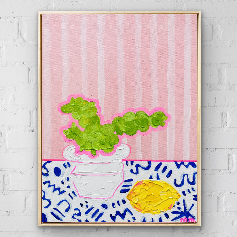 Acrylic on hand stretched canvas framed in a pine timber floating frame.