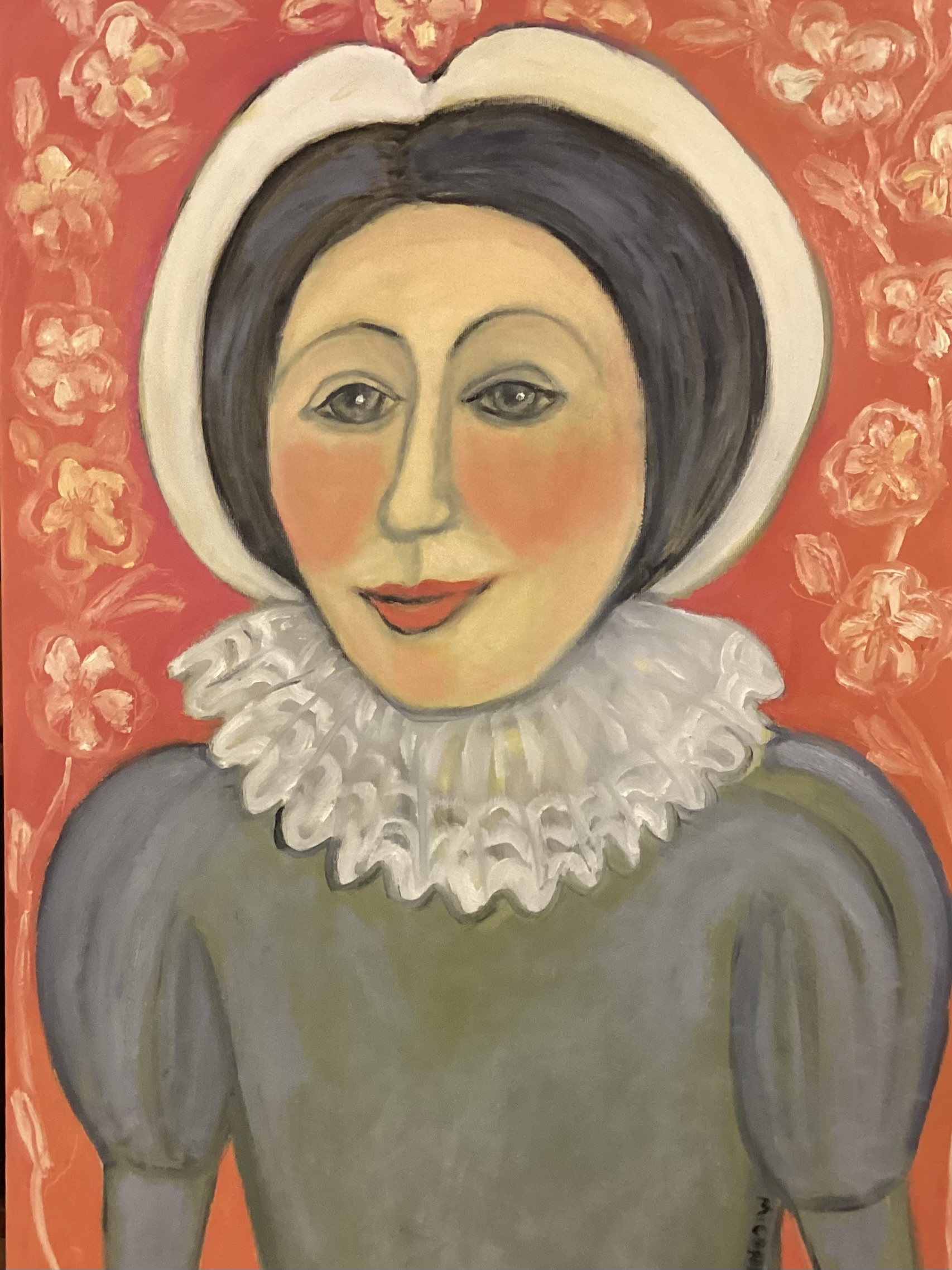 The inspiration from this came from Margaret’s drive to paint faces and in this case thé face became the inspiration for the subject .It took a while fir Margaret to decide thé direction of the painting but eventually it seemed to be appropriate ti paint a woman of early Tudor period but it was tge background colour being overwhelming thé white single petal roses lightened it , hence Ann of York . It is a Canvars canvas ;durable,Italian double acrylic primed,European certified fir wood,acid free hand stretched,warp resistant.Art spectrum oil paint and gel sealant have been used.D hooks have been applied and ready to hang No external frame.