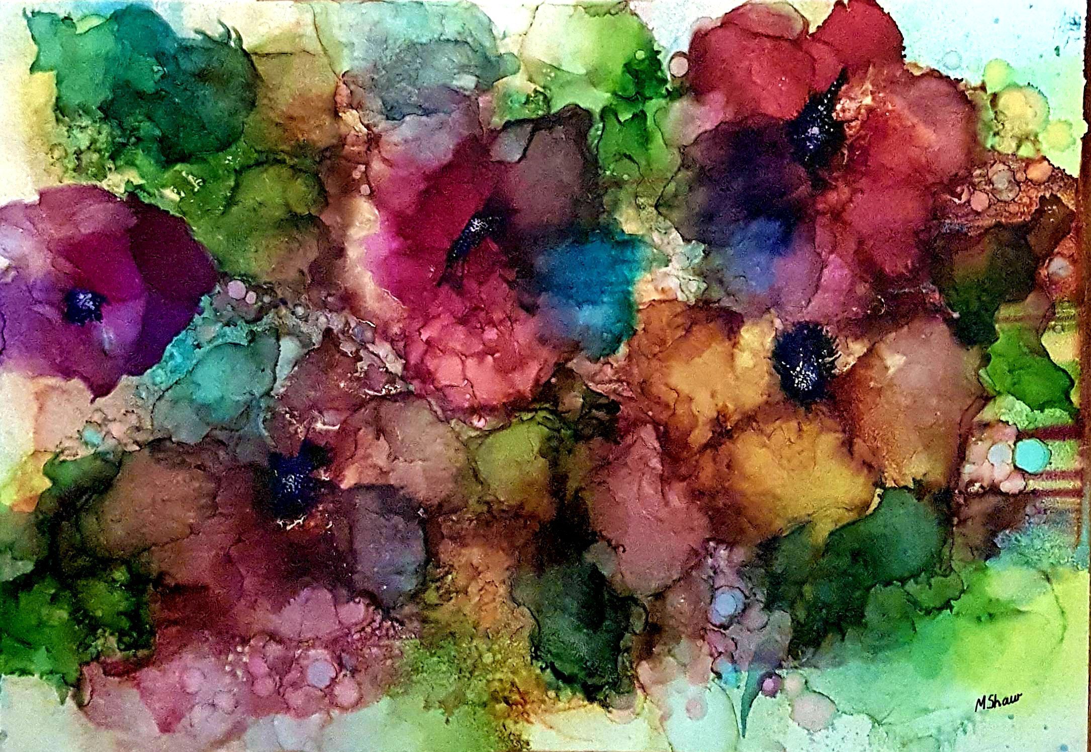 This fluid art piece is an impression of flowers. It is inspired by English country gardens in the spring and summertime, but with a delicate, antique look.