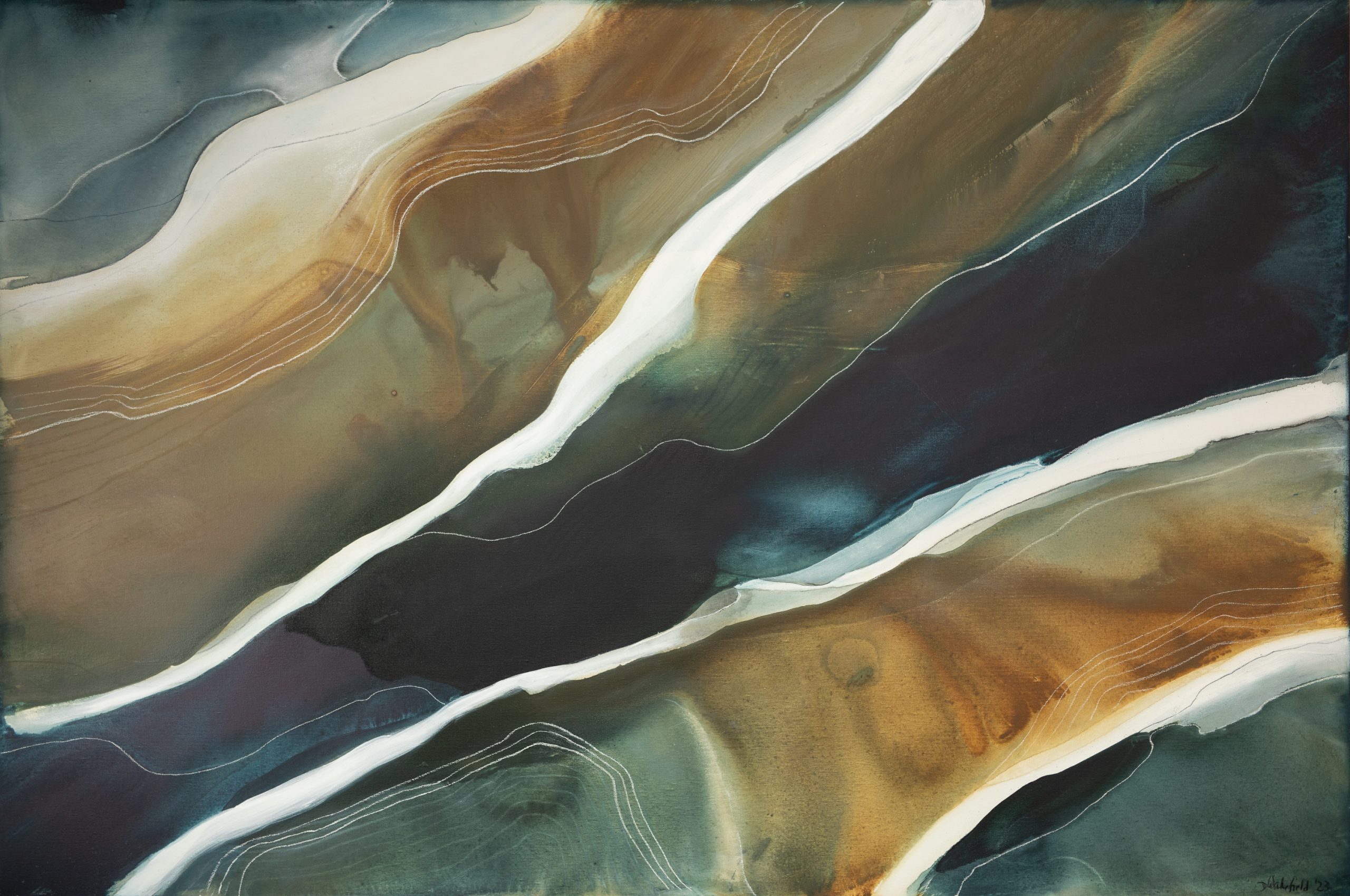 Aoraki 2 by Dinah Wakefield is inspired by the light, the colours and the natural beauty of the Noosa region of Australia. “What I love most about Noosa is the interplay of light. From the oceans to the clouds, to the river estuaries and the hinterland, this canvas unfolds before me every day and finds expression in my paintings”.
