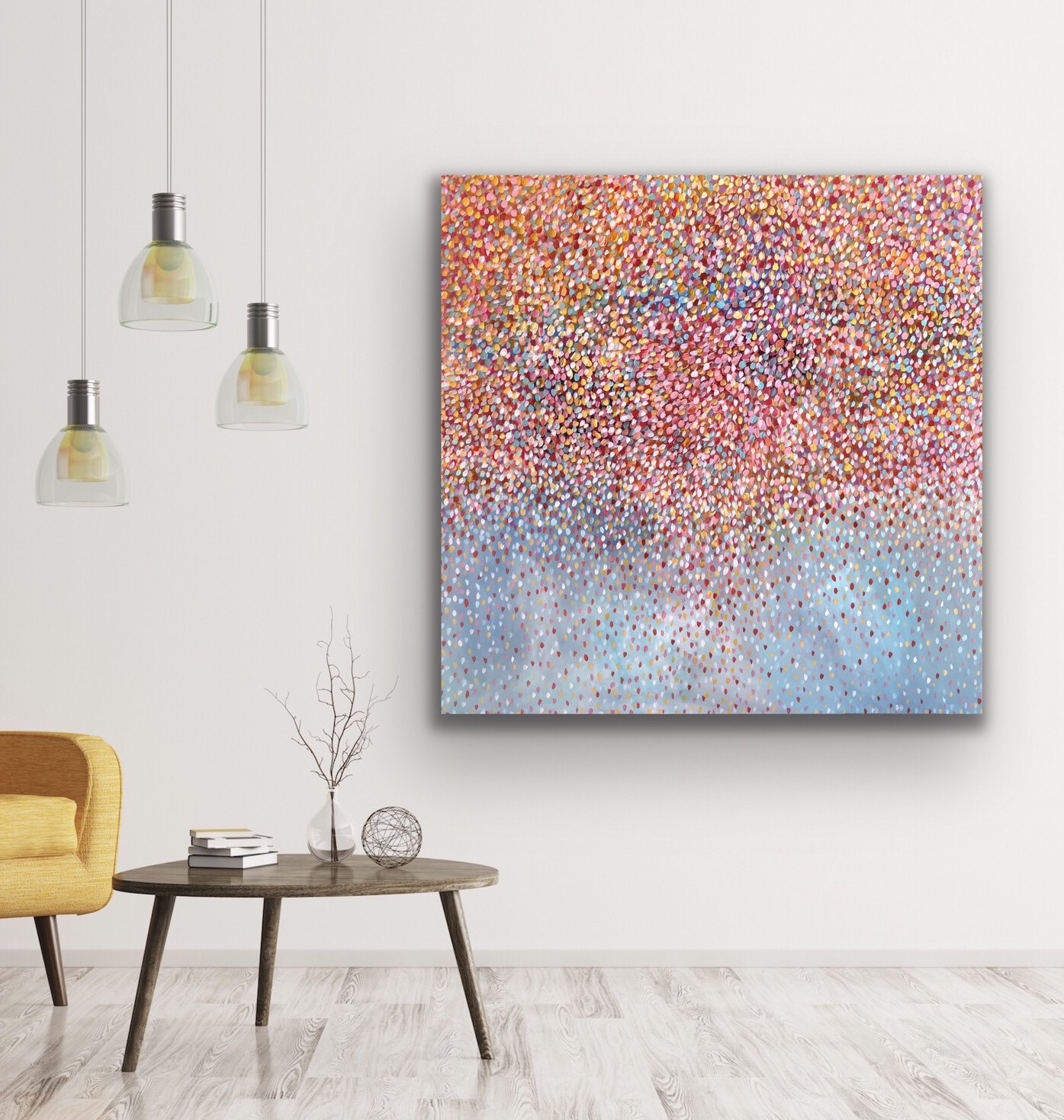 Aphrodites Petals by Theo Papathomas – A beautiful rainbow of petals in the sky falling onto the landscape creating an electric explosion of petals. A rainbow of blue petals in the sky like musical notes dancing to their own song. The painting is painted with acrylic paints .Hope with this s work it makes the viewer feel very peaceful and tranquil. This painting is signed and dated 2020 at the back of the painting and comes with a certificate of authenticity.
