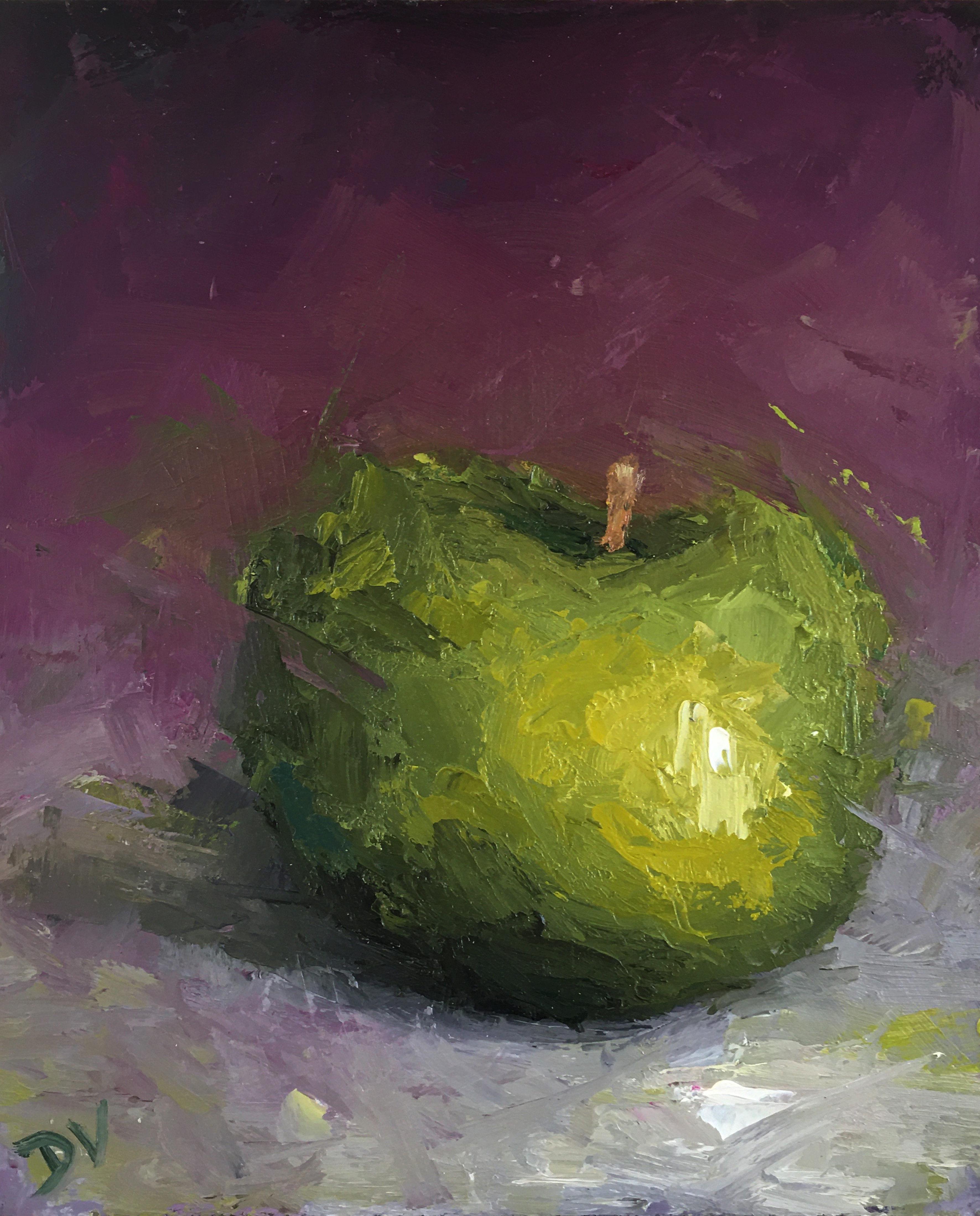 The magenta acts as a complimentary colour to the beautiful greens of the apple.